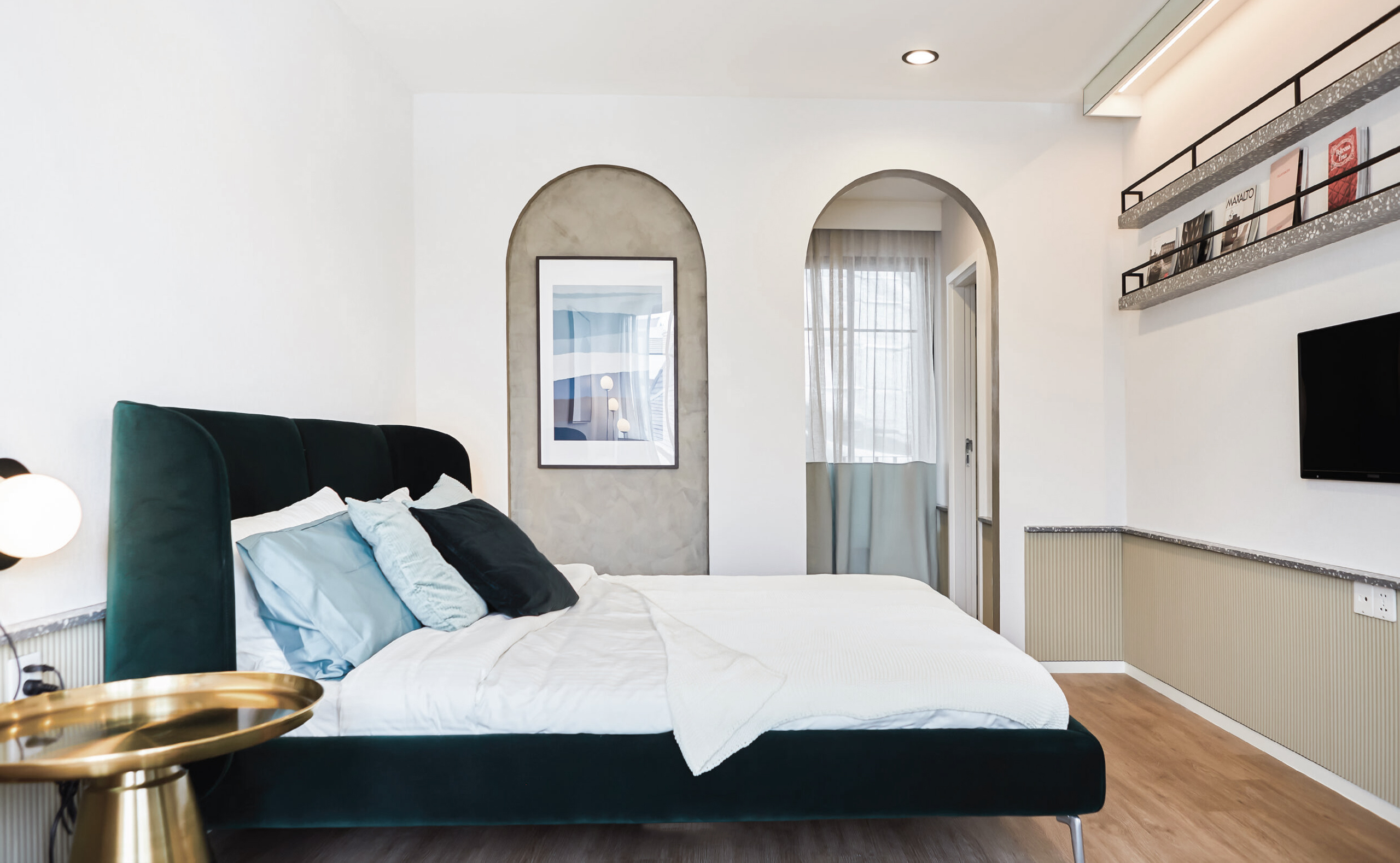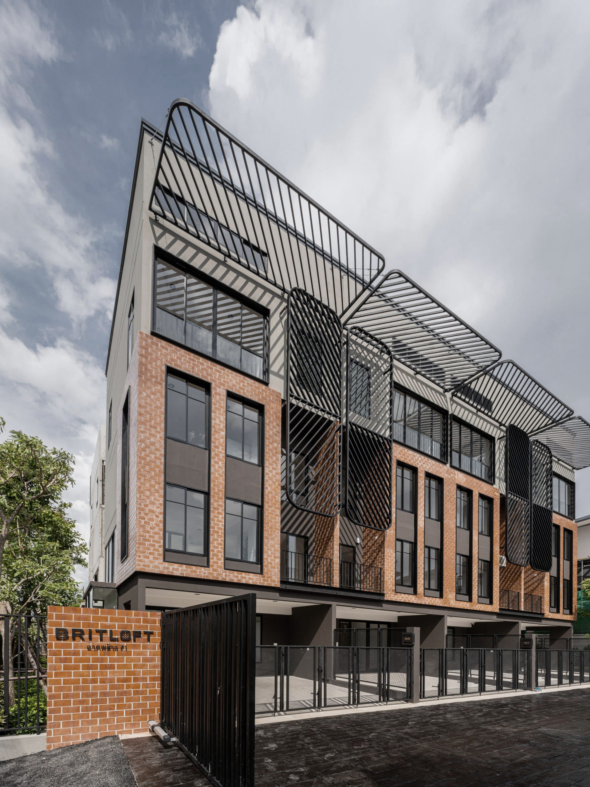 This collection of six attached townhouses celebrates the tactile beauty of masonry through a contemporary brick aesthetic. The facade features variegated tonal brickwork laid in intricate stack-bond and hit-and-miss patterns, creating a rhythmic play of light and shadow. Large, blackened steel-framed apertures punch through the clay exterior, grounding the industrial warmth of the material in a modern context. Inside, the atmosphere shifts to a minimalist Mid-Century retreat. The design prioritizes organic simplicity, featuring warm teak cabinetry, tapered furniture silhouettes, and polished concrete floors. By stripping away clutter, the interior emphasizes functional beauty and "post-and-beam" spatial clarity. It is a sophisticated marriage of rugged urban texture and the timeless, airy grace of 1950s modernism.