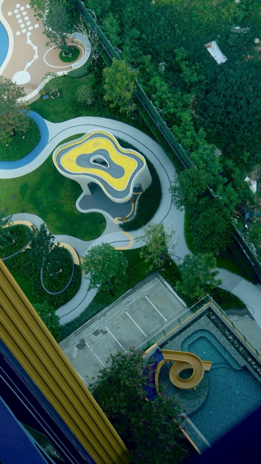This 53,000 sq.m. condominium is a vibrant landmark of modern colorful architecture, utilizing a bold, chromatic palette to define its presence. The project centers on a series of unique spatial connections, most notably a massive spiral sculptural staircase that winds through the central atrium, serving as both a functional artery and a piece of kinetic art. The design blurs the line between built form and nature through a stepped landscape that cascades down the building’s levels, creating lush social plateaus. Giant, overscaled tree pots are integrated directly into the structural frame, allowing towering greenery to punctuate the sky-gardens. This playful interaction of vivid hues, adventurous geometry, and monumental nature creates an immersive, high-energy living environment that celebrates vertical connectivity.