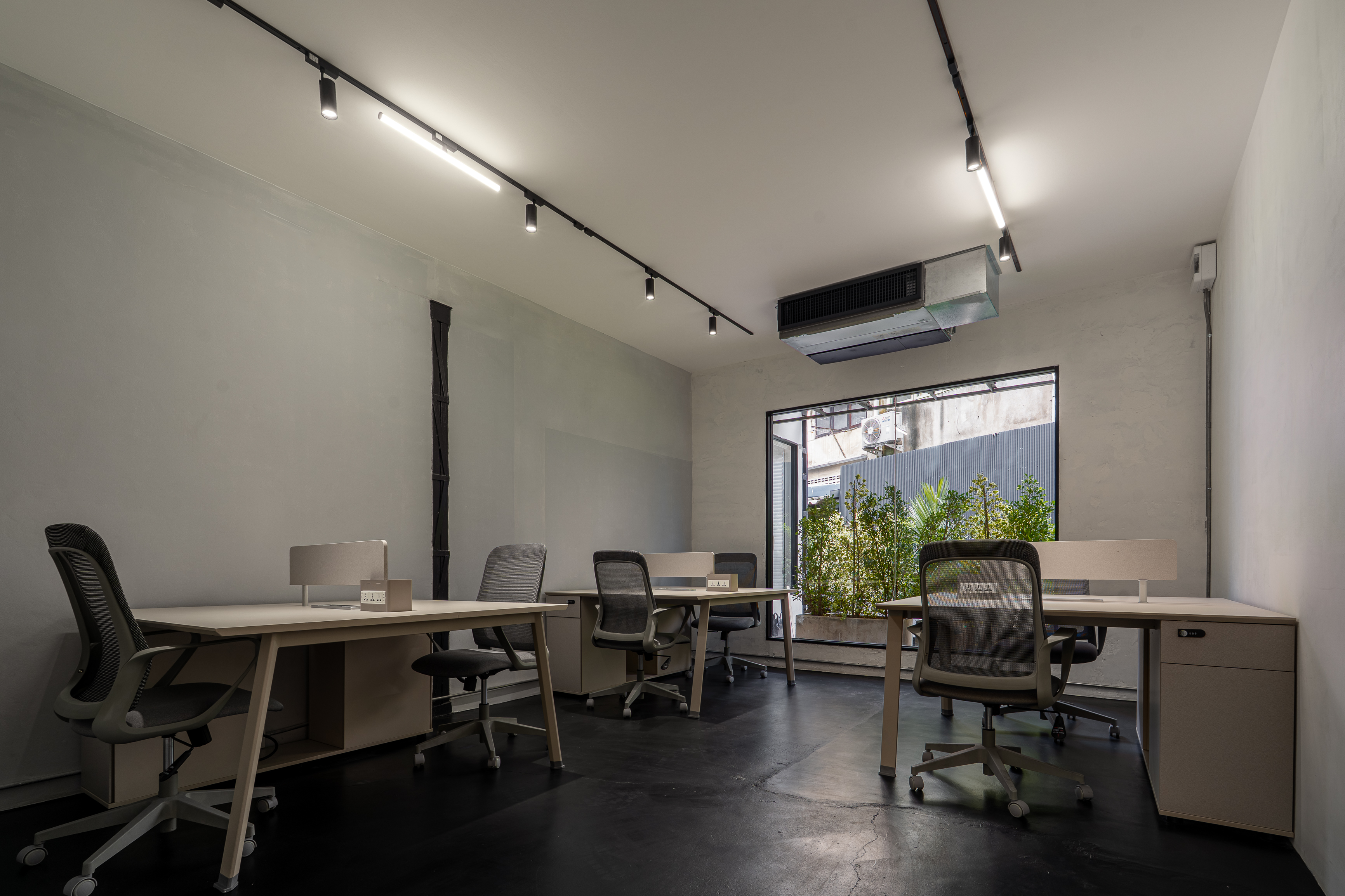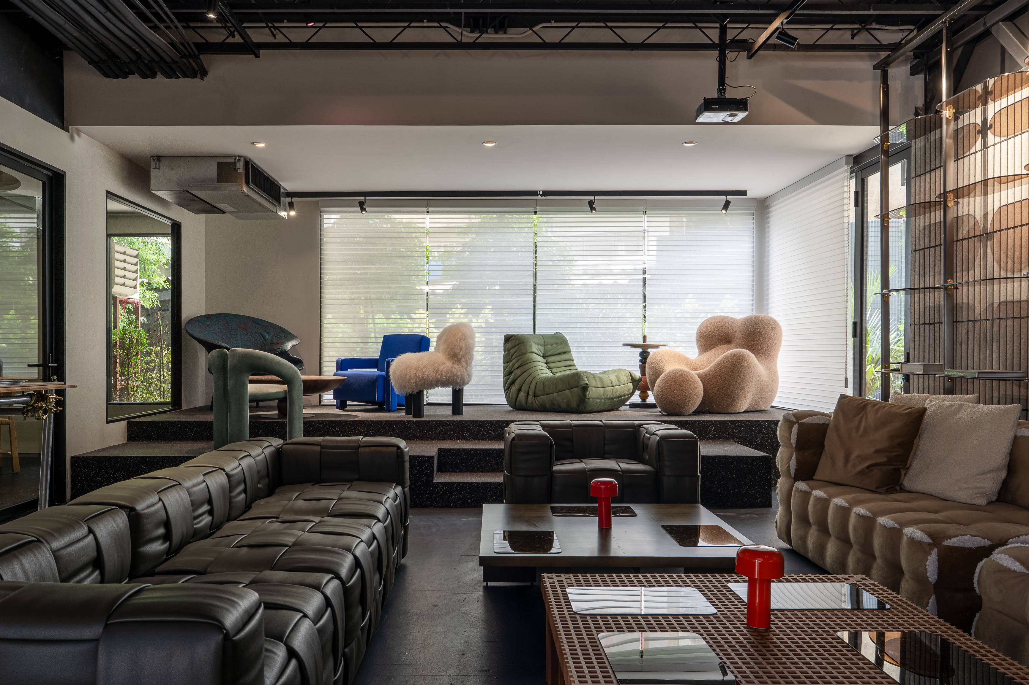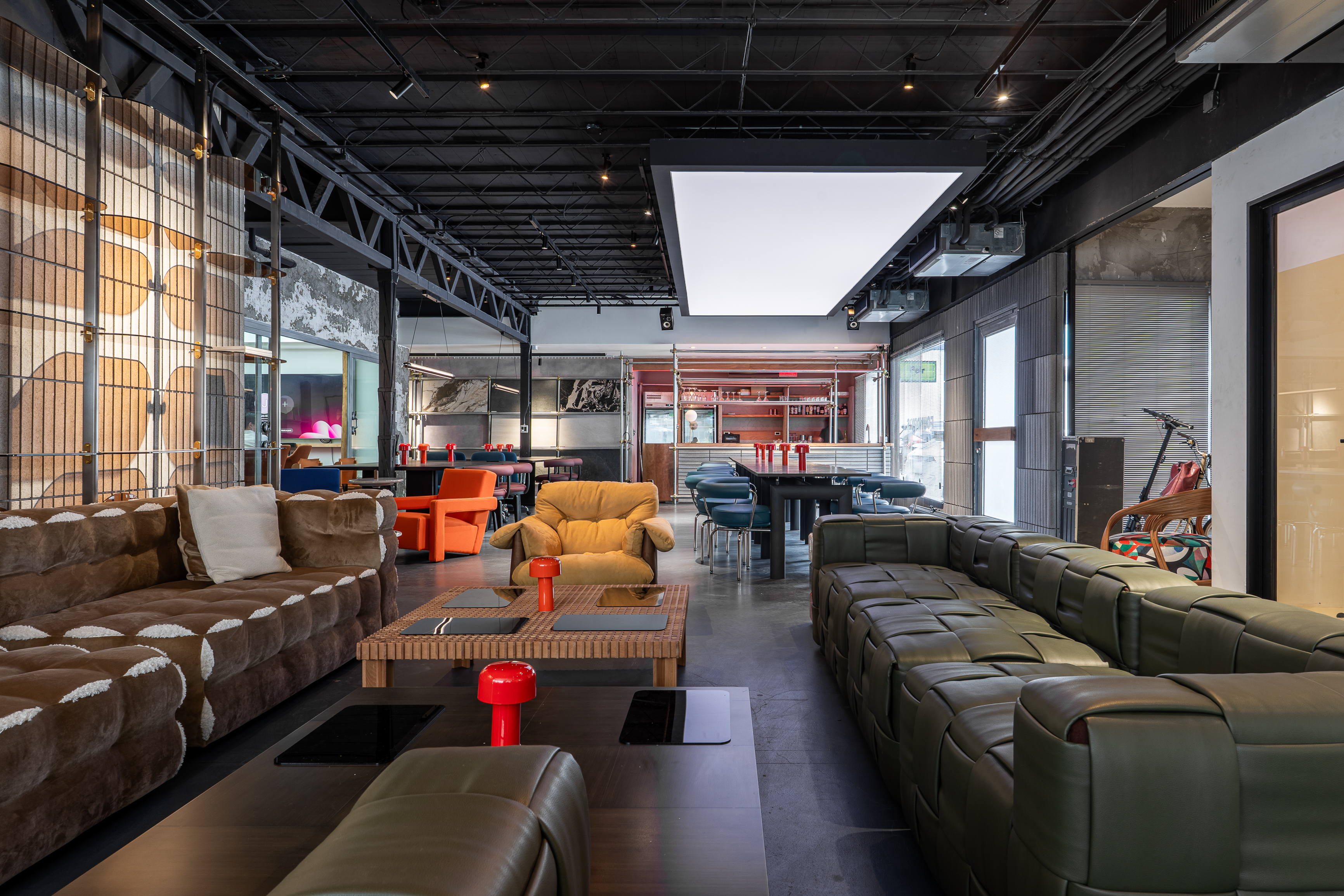 This 700 sq.m. hybrid space is a moody, intellectual collision of Brutalist architecture and mid-century Italian panache. Raw, board-formed concrete walls and exposed structural beams provide a rugged, monastic backdrop for a curated collection of 1950s Italian furniture, featuring svelte Gio Ponti-style chairs and velvet-upholstered lounges. The Matcha Long table, a monolithic slab of dark stone, anchors the room, serving ceremonial grades in a setting that feels like a high-design sanctuary. The atmosphere is purely cinematic, driven by dramatic spotlighting that carves the space into intimate pools of light and shadow. Suspended from the industrial ceiling, classic Bose 802 speakers deliver a warm, high-fidelity soundscape, completing the sensory experience. It is a sophisticated haven for creators—a place where the grit of concrete meets the grace of Milanese modernism