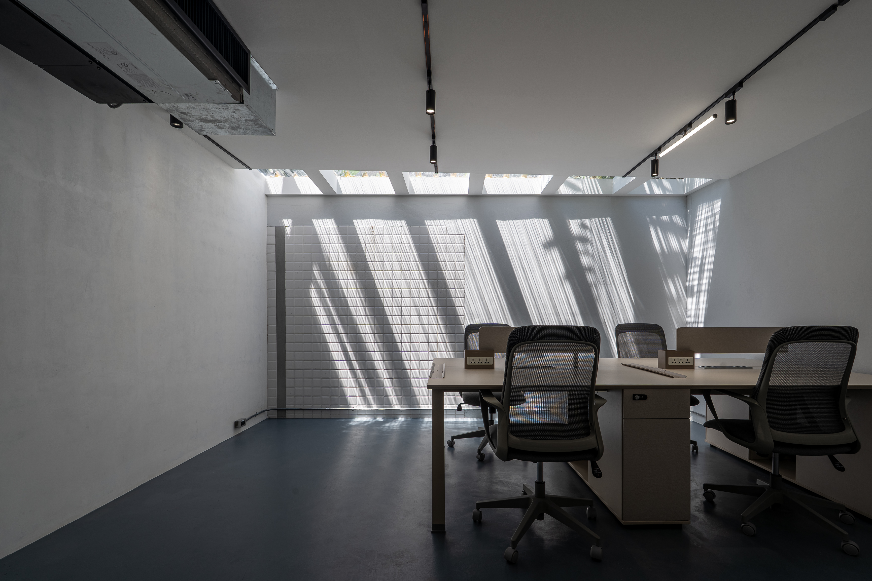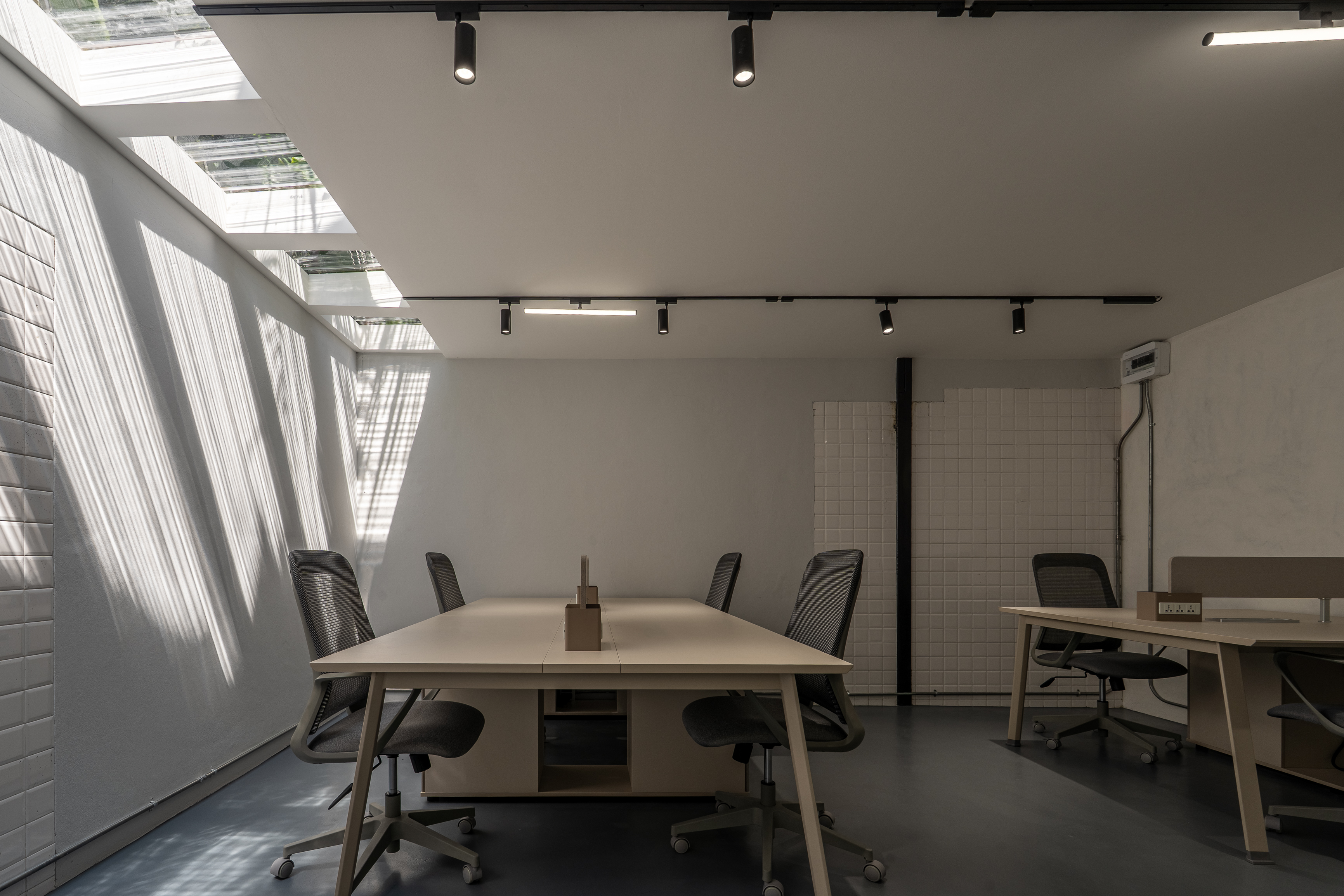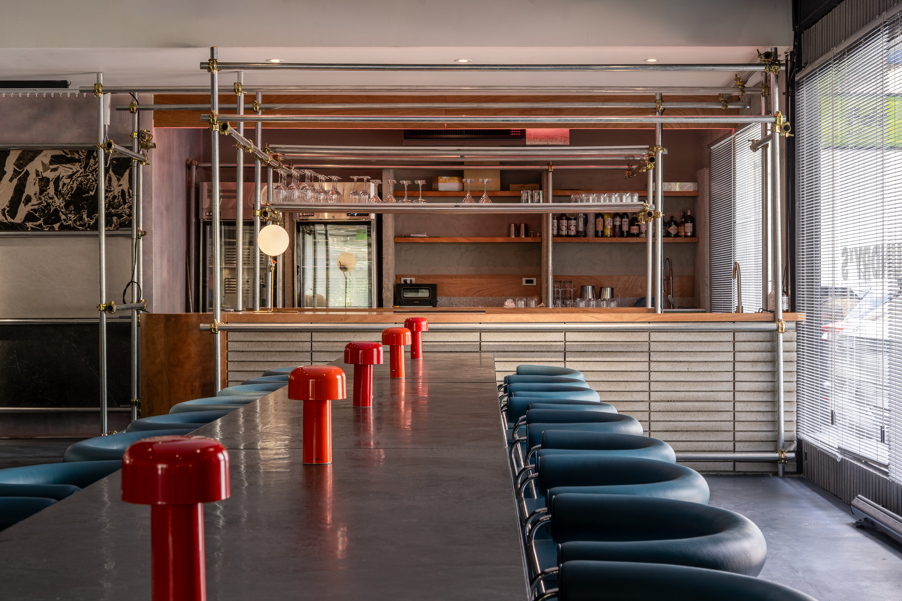 This 700 sq.m. hybrid space is a moody, intellectual collision of Brutalist architecture and mid-century Italian panache. Raw, board-formed concrete walls and exposed structural beams provide a rugged, monastic backdrop for a curated collection of 1950s Italian furniture, featuring svelte Gio Ponti-style chairs and velvet-upholstered lounges. The Matcha Long table, a monolithic slab of dark stone, anchors the room, serving ceremonial grades in a setting that feels like a high-design sanctuary. The atmosphere is purely cinematic, driven by dramatic spotlighting that carves the space into intimate pools of light and shadow. Suspended from the industrial ceiling, classic Bose 802 speakers deliver a warm, high-fidelity soundscape, completing the sensory experience. It is a sophisticated haven for creators—a place where the grit of concrete meets the grace of Milanese modernism