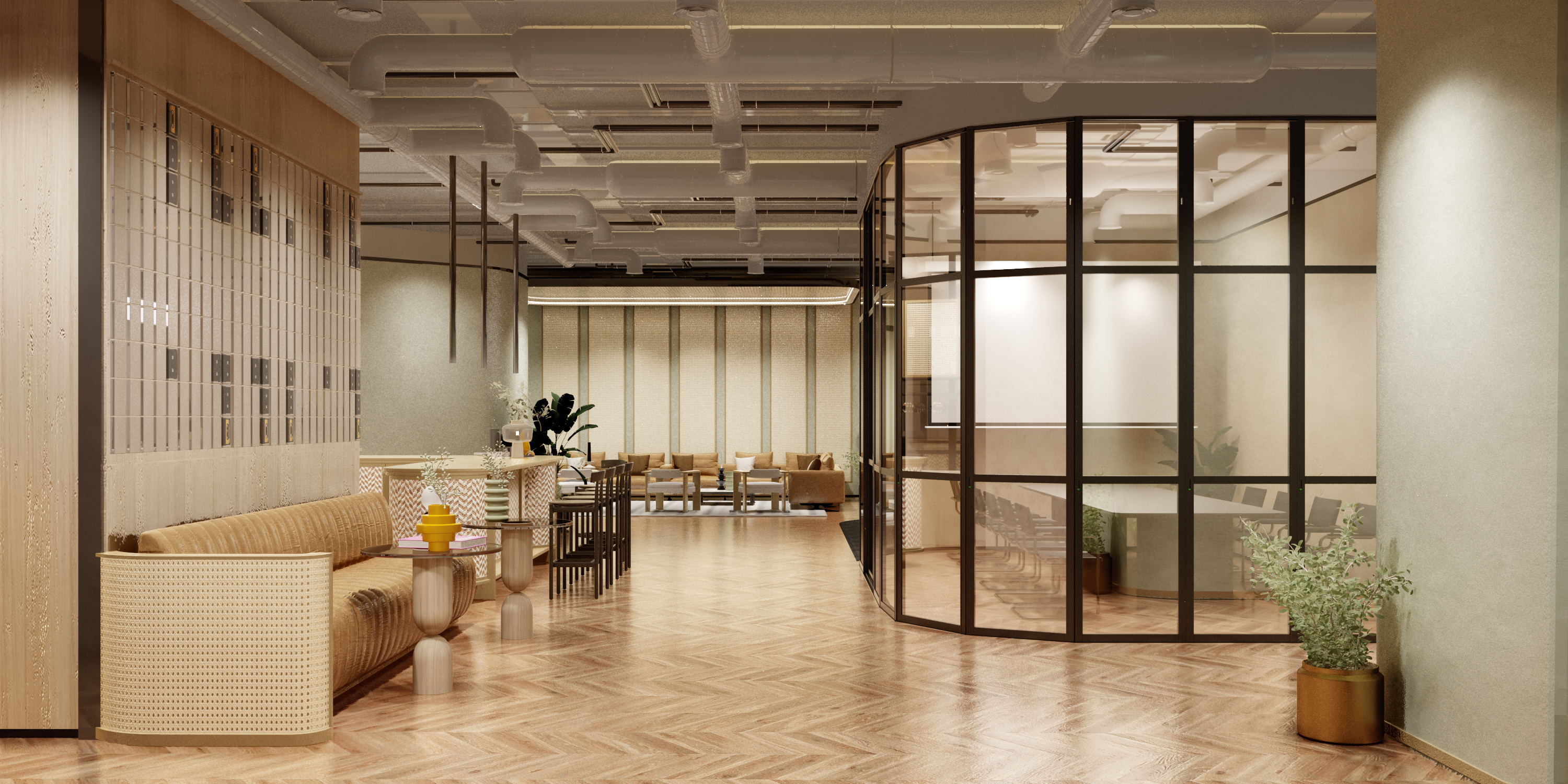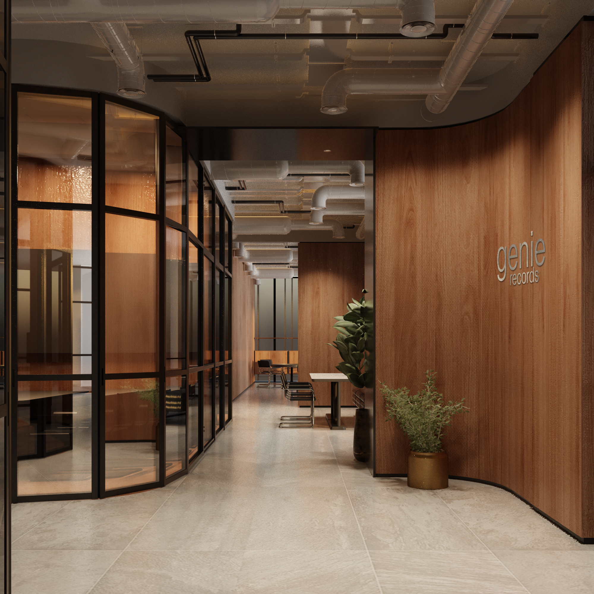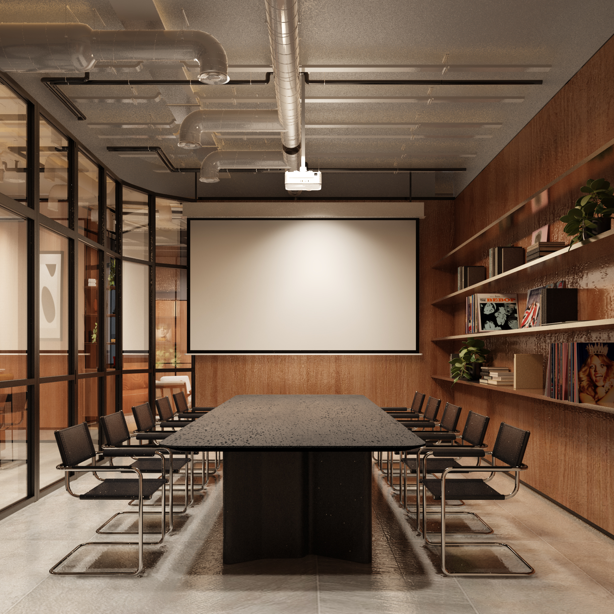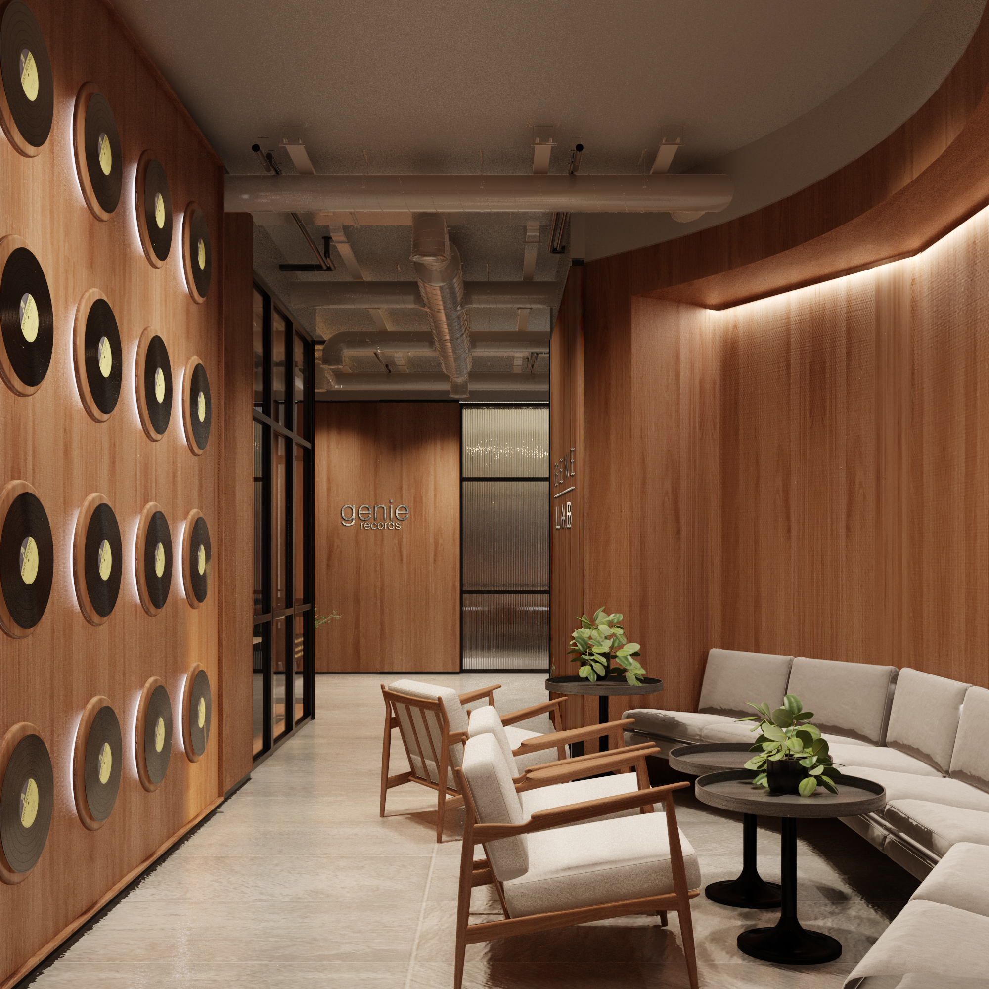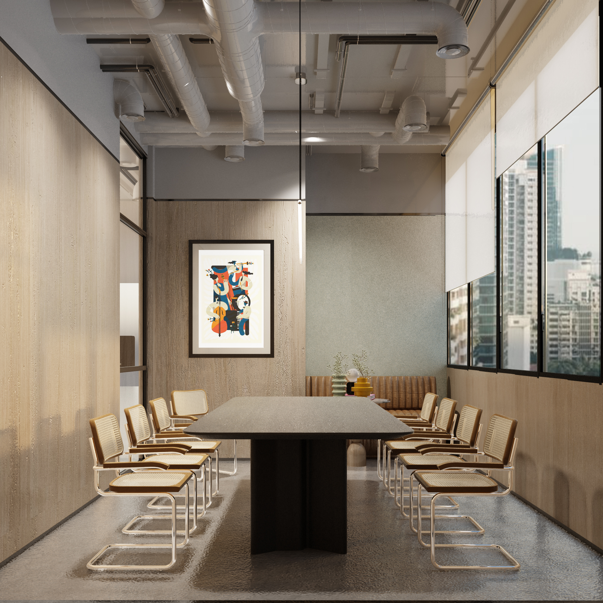 This office reimagines Mid-Century Modern design through a vibrant lens of Thai Pop and Country (Luk Thung) culture. The sleek lines of teak wood desks and iconic tapered-leg chairs are playfully disrupted by the neon-drenched energy of a retro Bangkok record shop. Hand-painted vintage movie posters and framed vinyl records—from classic Molam to psychedelic Thai funk—adorn the walls, creating a rhythmic, gallery-like workspace that celebrates musical heritage. The atmosphere is a soulful mix of "Jim Thompson" elegance and "Isan" soul, featuring woven rattan textures paired with pop-art tributes to Thai music icons. It’s a space where creative innovation is fueled by a nostalgic, high-fidelity soundtrack, blending high-design discipline with the colorful, unapologetic charm of Thai regional pride.