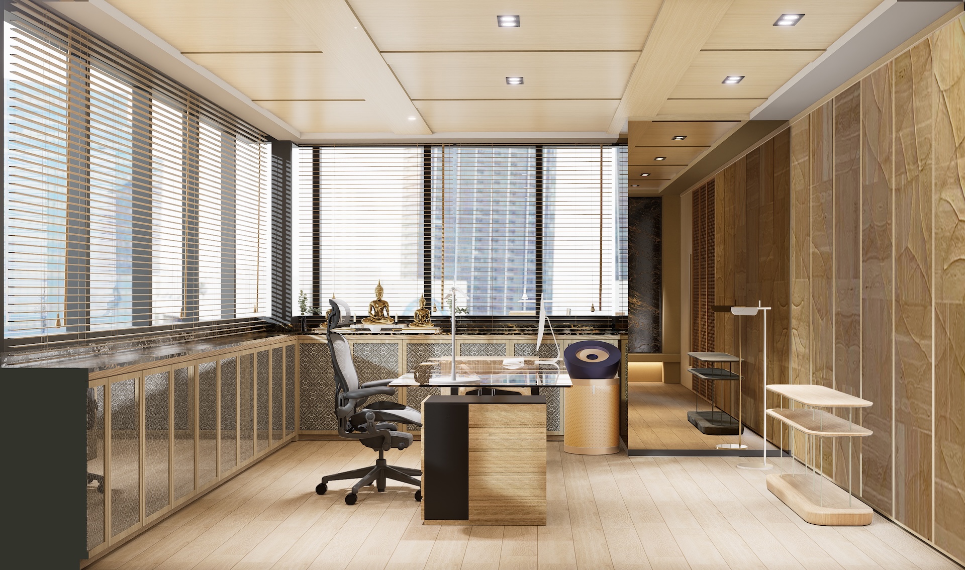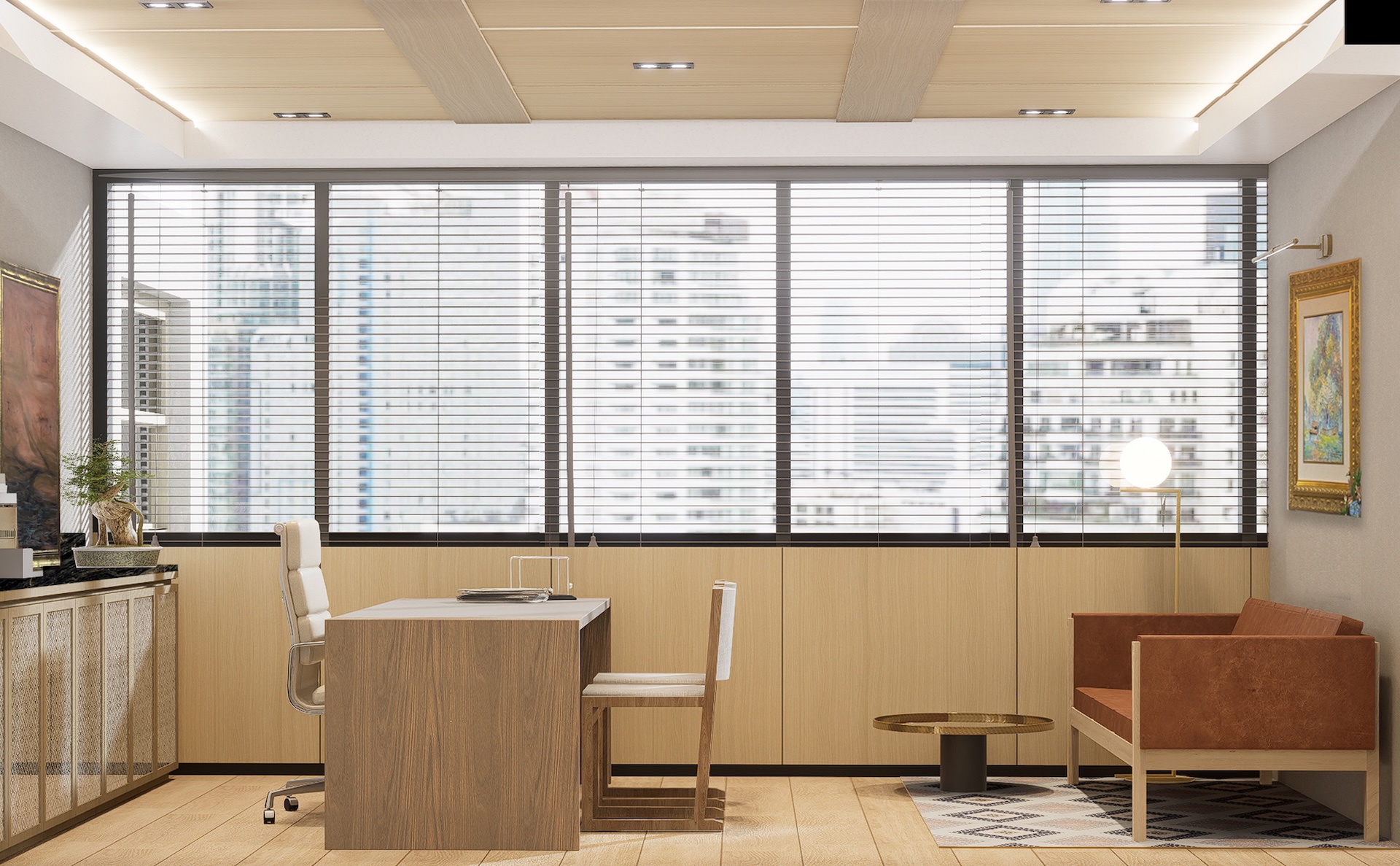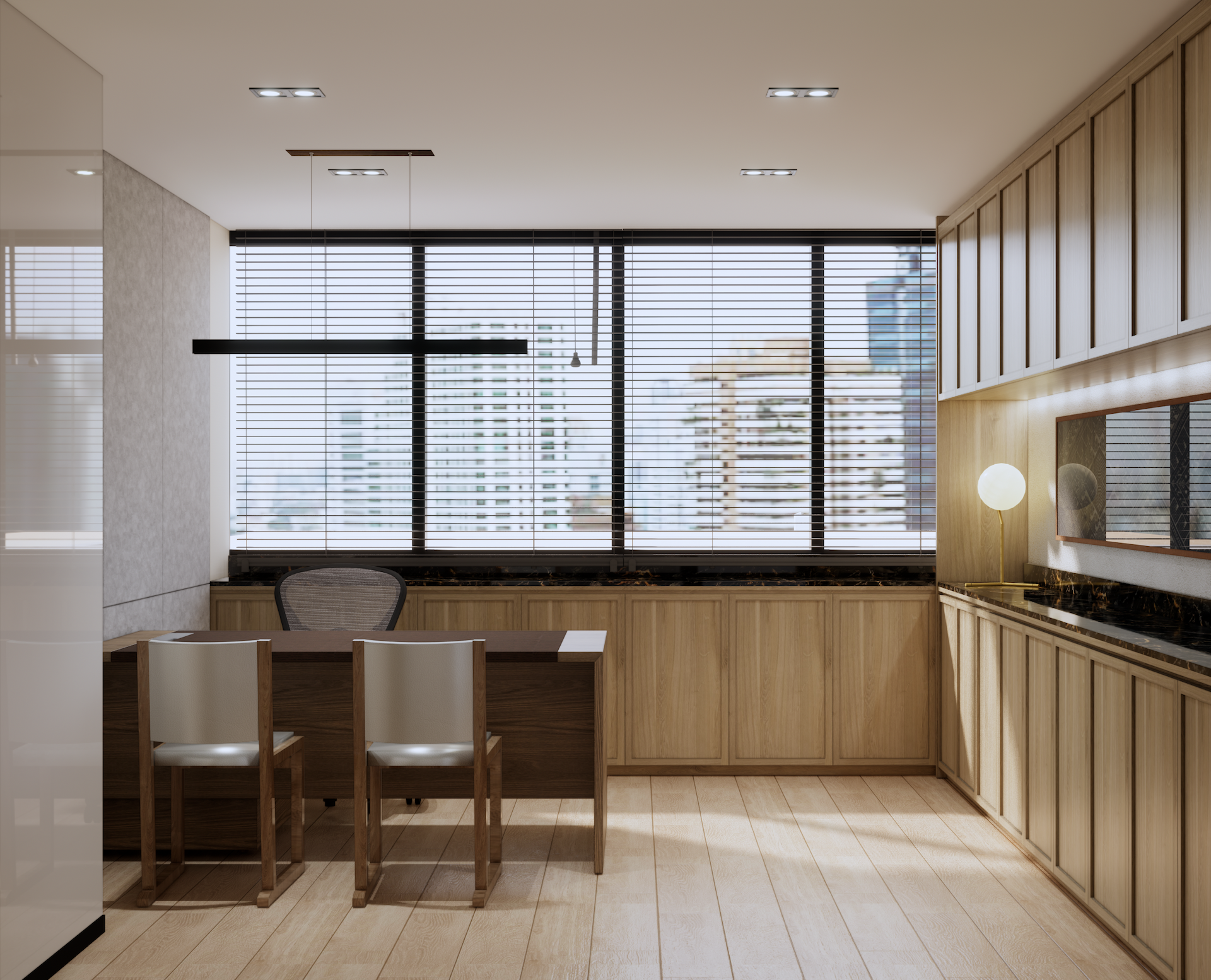 This Modern Japanese office is a sanctuary of cultural dialogue, where minimalist precision meets world-class artistry. The lobby entrance serves as a breathtaking threshold, anchored by a monumental Shoji wall crafted by a Japanese national artist, redefining traditional light filtration as a modern architectural statement. This "less is more" philosophy extends through the open-plan areas, defined by blonde timber and clean geometric lines. In the Managing Director’s private quarter, the atmosphere deepens with an exquisite Awashimono piece—a masterwork of wood carving —by a Japanese national artist, symbolizing structural depth and wisdom. Contrasting this, the private consultation rooms feature Laotian fabrics meticulously rendered in the Thai-Inu style, blending intricate Indochinese weaving with Japanese aesthetic restraint. It is a workspace where high-level diplomacy and design intersect, celebrating the shared heritage of the Silk Road through a contemporary, luminous lens.