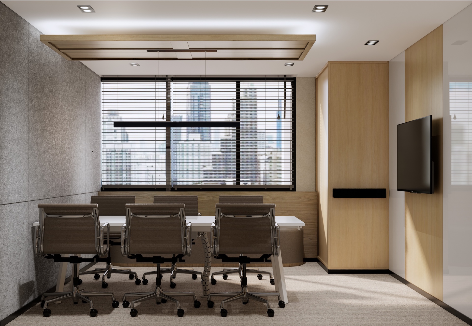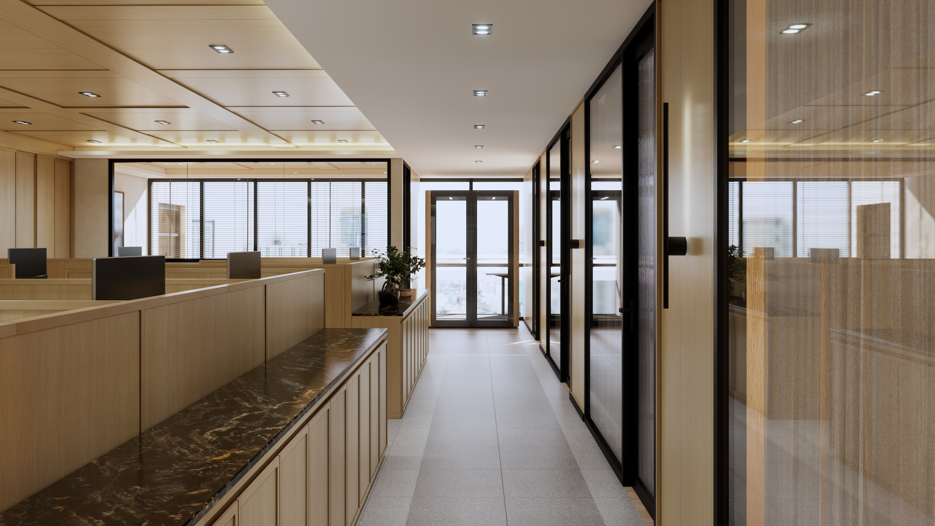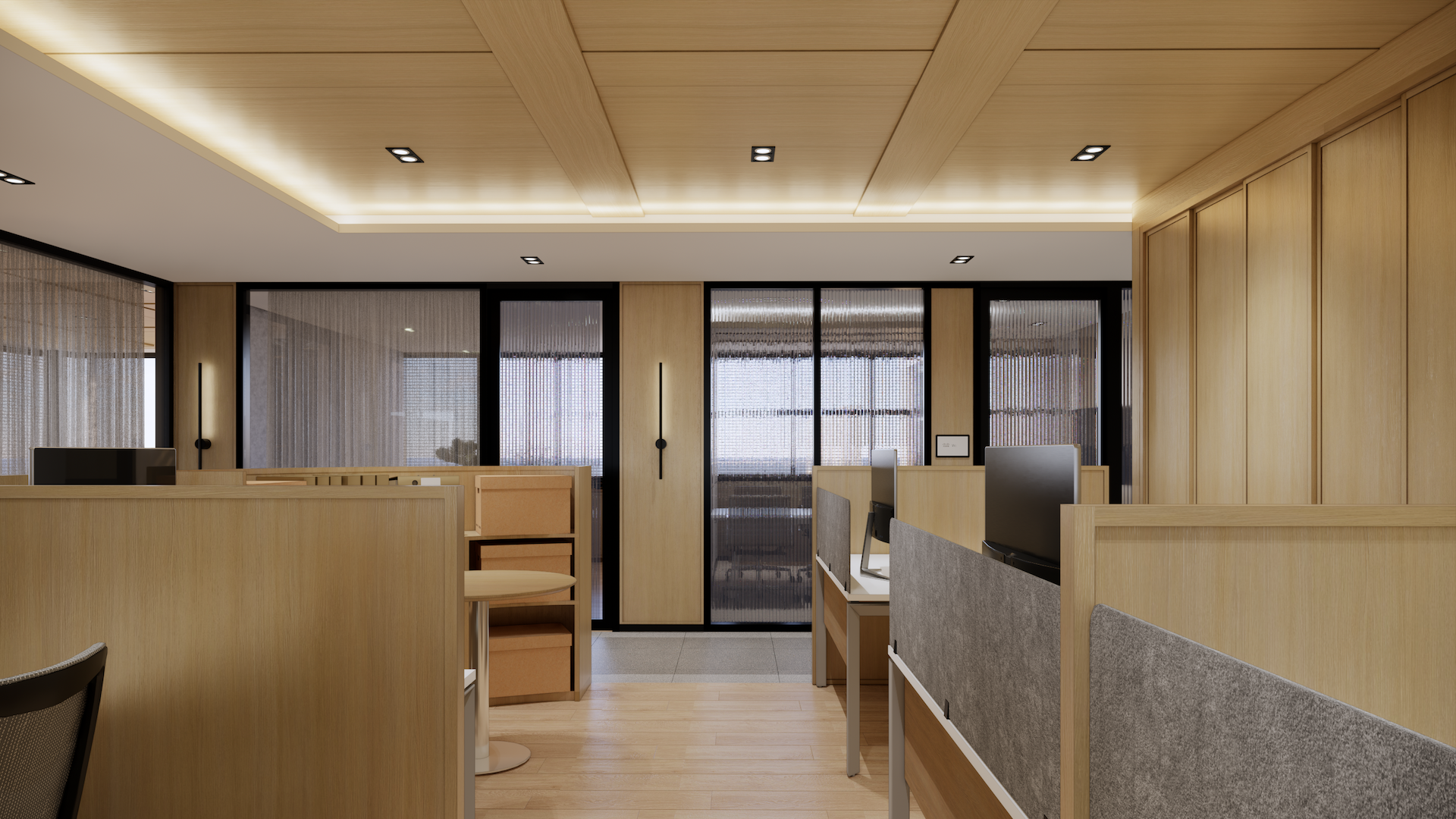 This Modern Japanese office is a sanctuary of cultural dialogue, where minimalist precision meets world-class artistry. The lobby entrance serves as a breathtaking threshold, anchored by a monumental Shoji wall crafted by a Japanese national artist, redefining traditional light filtration as a modern architectural statement. This "less is more" philosophy extends through the open-plan areas, defined by blonde timber and clean geometric lines. In the Managing Director’s private quarter, the atmosphere deepens with an exquisite Awashimono piece—a masterwork of wood carving —by a Japanese national artist, symbolizing structural depth and wisdom. Contrasting this, the private consultation rooms feature Laotian fabrics meticulously rendered in the Thai-Inu style, blending intricate Indochinese weaving with Japanese aesthetic restraint. It is a workspace where high-level diplomacy and design intersect, celebrating the shared heritage of the Silk Road through a contemporary, luminous lens.