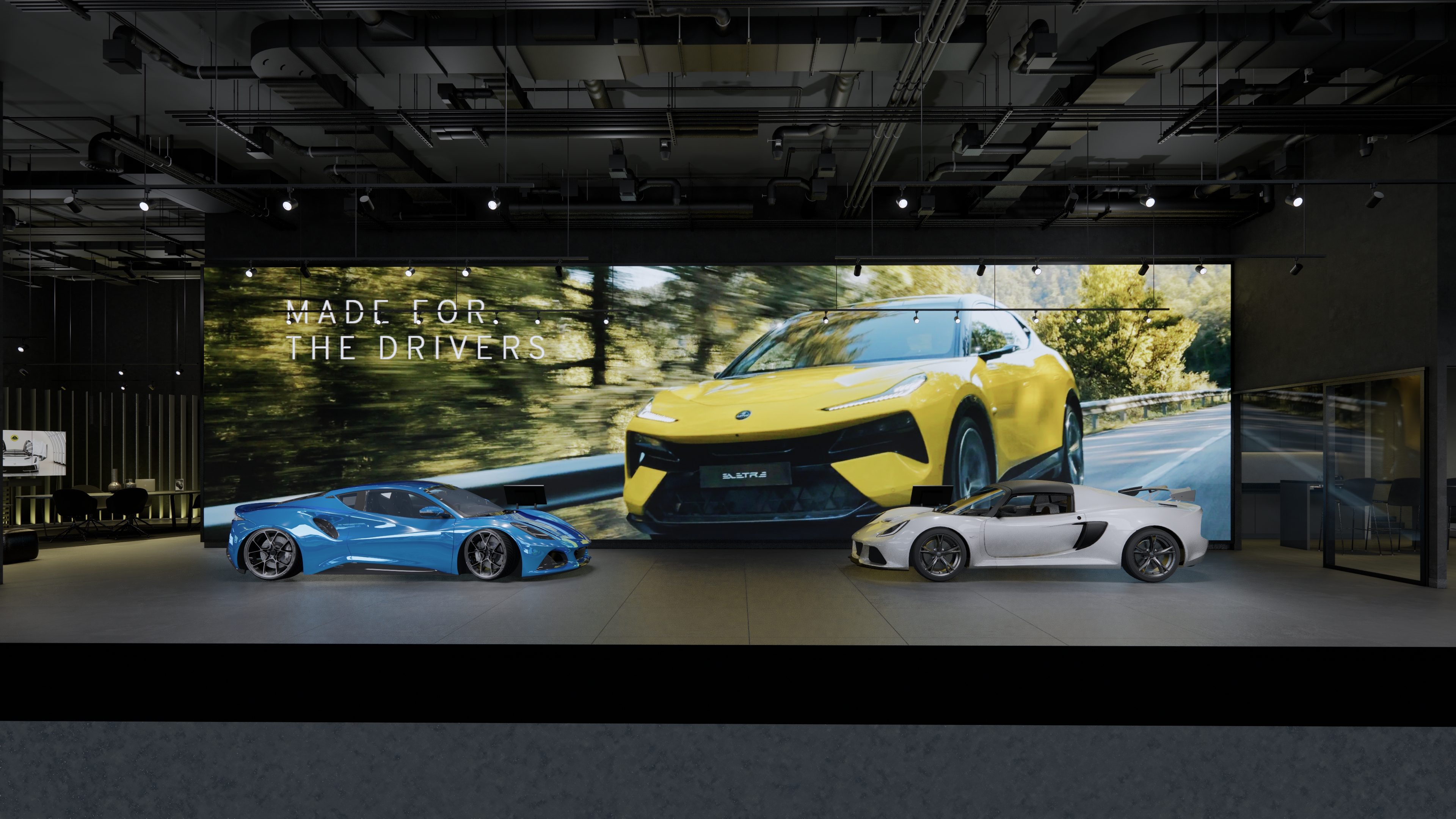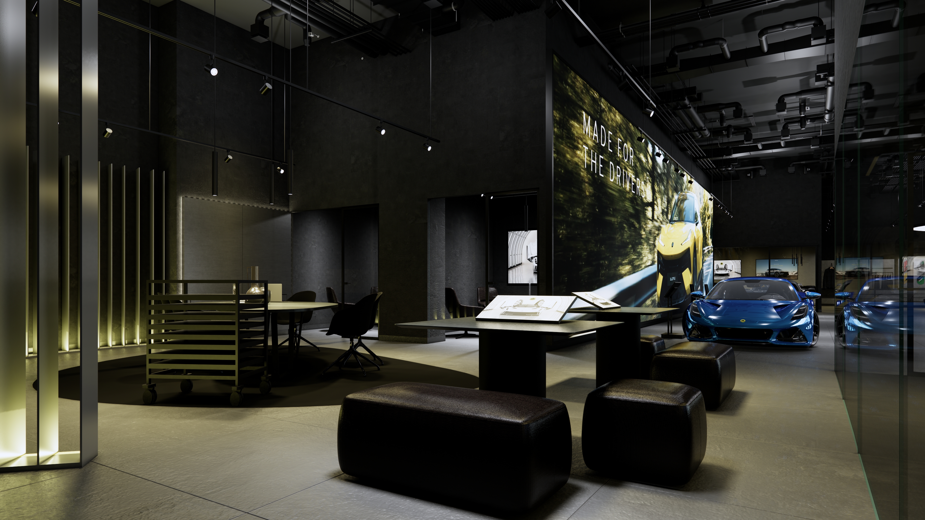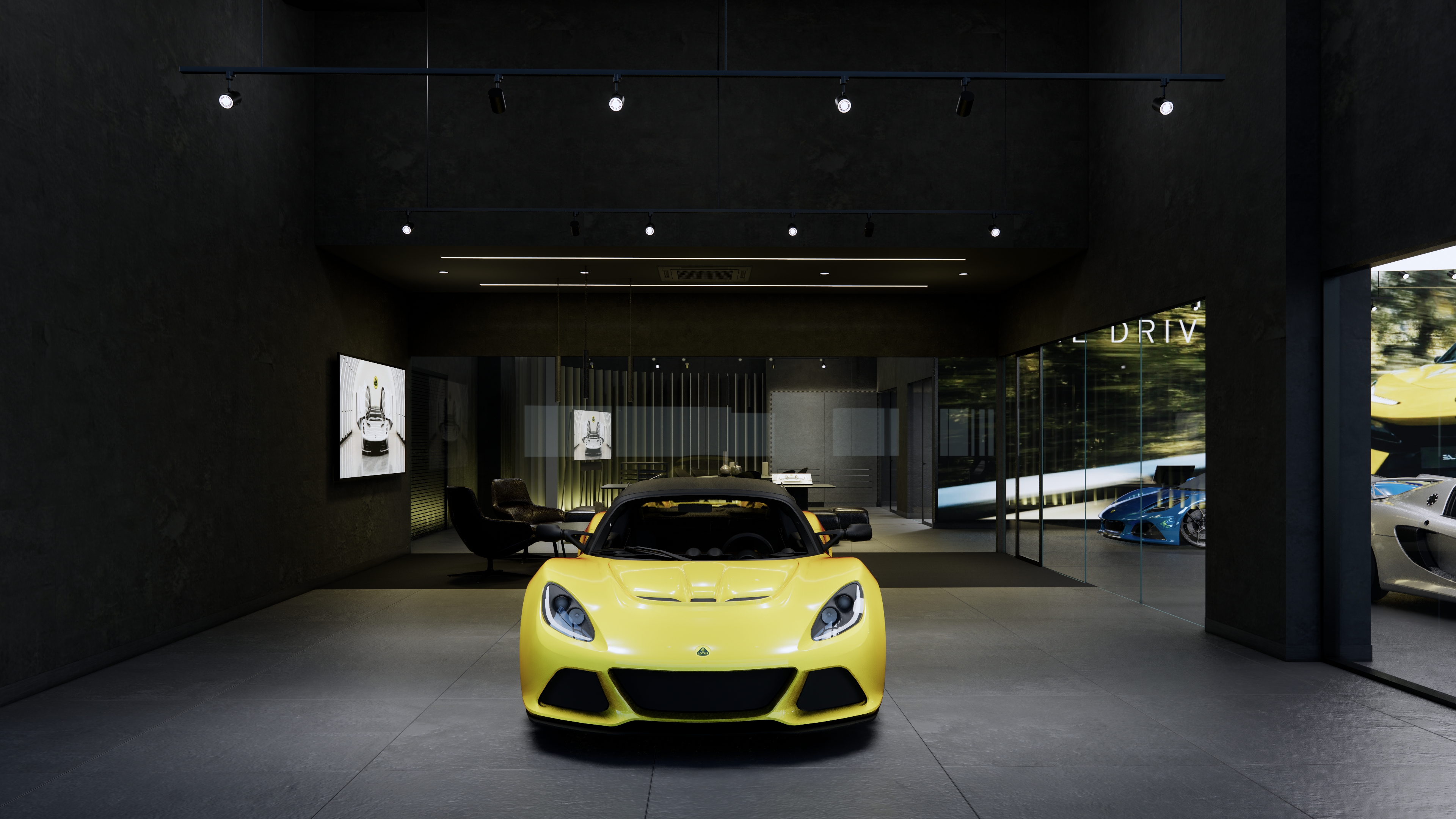 The Lotus Supercar Showroom and Service Center is a temple of aerodynamic speed, designed with a monolithic, black-glazed exterior. The minimalist architecture acts as a dark prism, featuring expansive smoked-glass facades that provide a tantalizing glimpse into the high-octane world within. By stripping away all visual noise, the structure embodies the Lotus philosophy of "lightness," using a midnight palette to create a sense of mystery and gravitational pull. Inside, the atmosphere is electric. Dramatic interior light panels and recessed LED arrays carve through the shadows, illuminating each supercar as a high-performance sculpture. These light "veins" emphasize the carbon-fiber curves and precision engineering of the vehicles, transforming the showroom into a dark gallery where the cars are the sole protagonists. It is a space defined by speed, shadows, and the stark beauty of illuminated power.