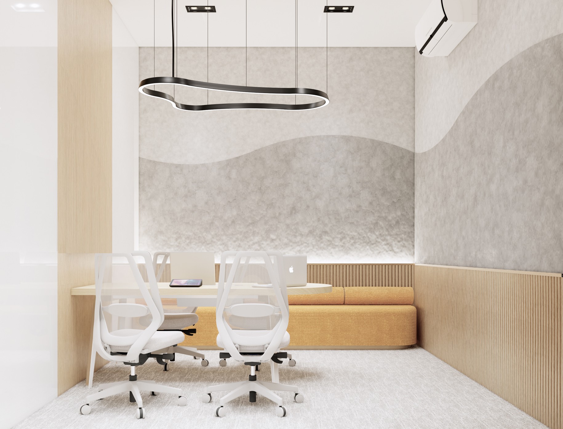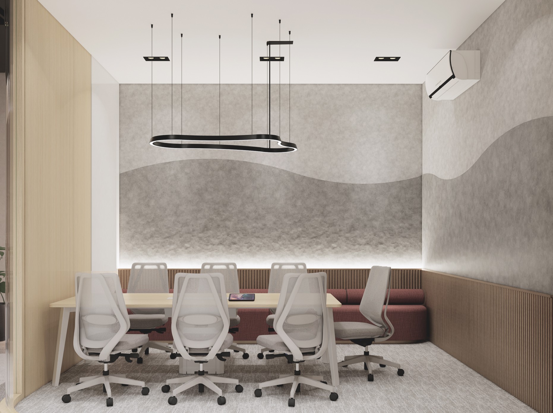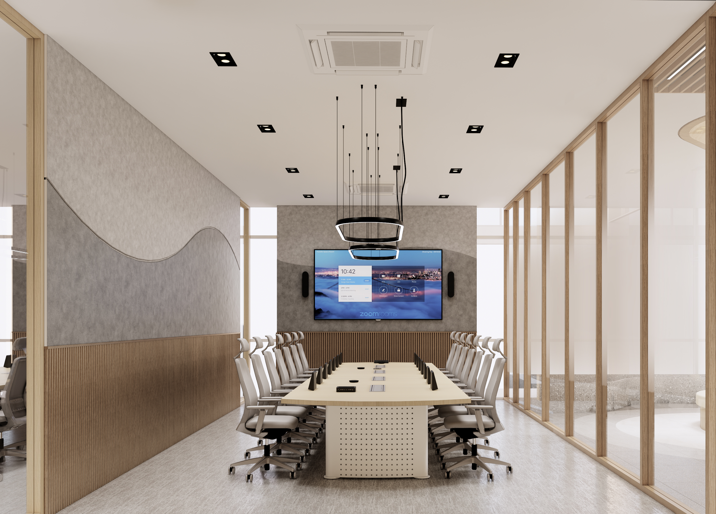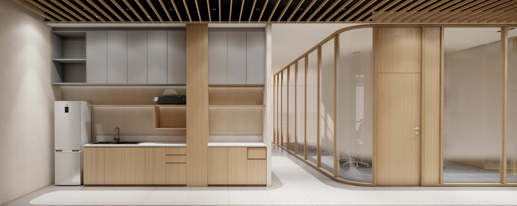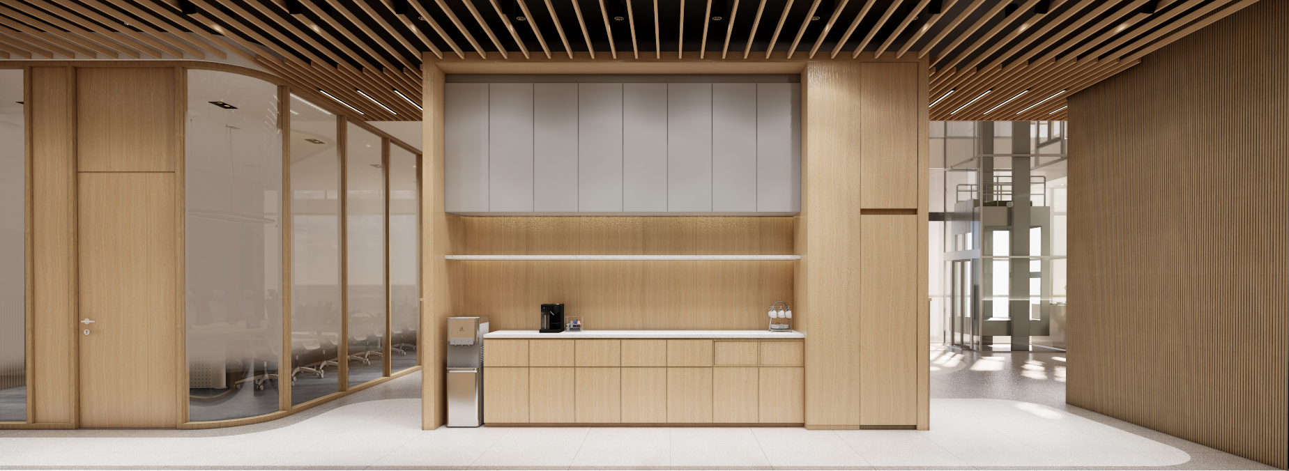 This regional headquarters for the Mitsubishi Industrial Company Group is a vibrant evolution of Japandi design, where industrial precision meets organic warmth. The concept is anchored in Komorebi—the poetic Japanese term for sunlight filtering through leaves. This is achieved through rhythmic timber slats and perforated metal screens that create a dynamic movement of light and shadow across the floor plate, shifting throughout the day to mirror the natural rhythm of the sun. The workspace is a lush biophilic sanctuary, featuring internal bamboo groves and moss-covered feature walls that soften the clean, geometric lines. Accents of Mitsubishi’s corporate palette are woven into the natural textures through "colorful Japandi" elements—muted terracottas and deep teals—ensuring the office feels both professional and revitalizing. It is a high-performance environment where the mechanical and the medicinal properties of nature exist in perfect, luminous harmony.