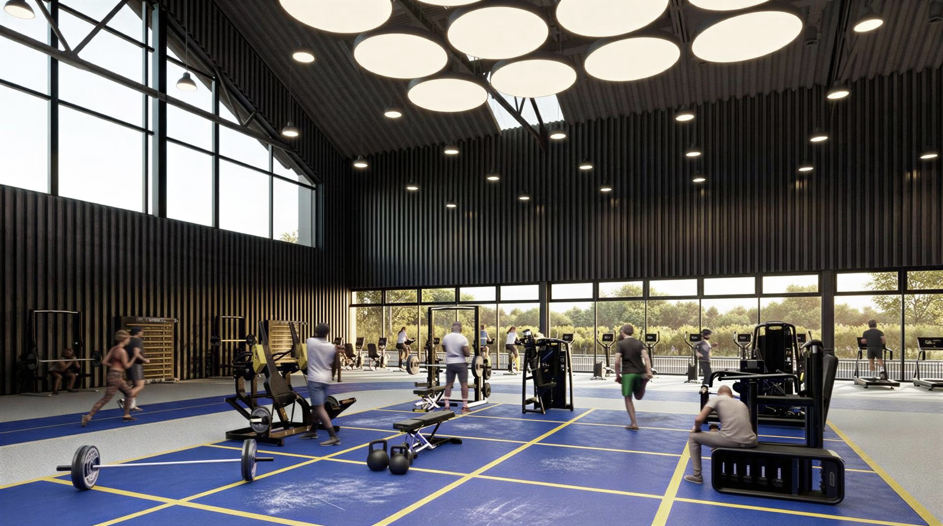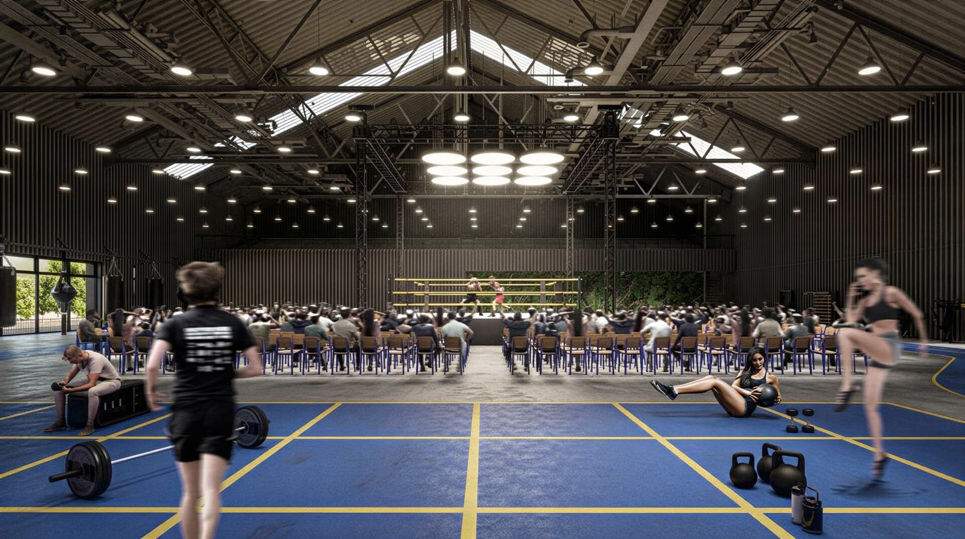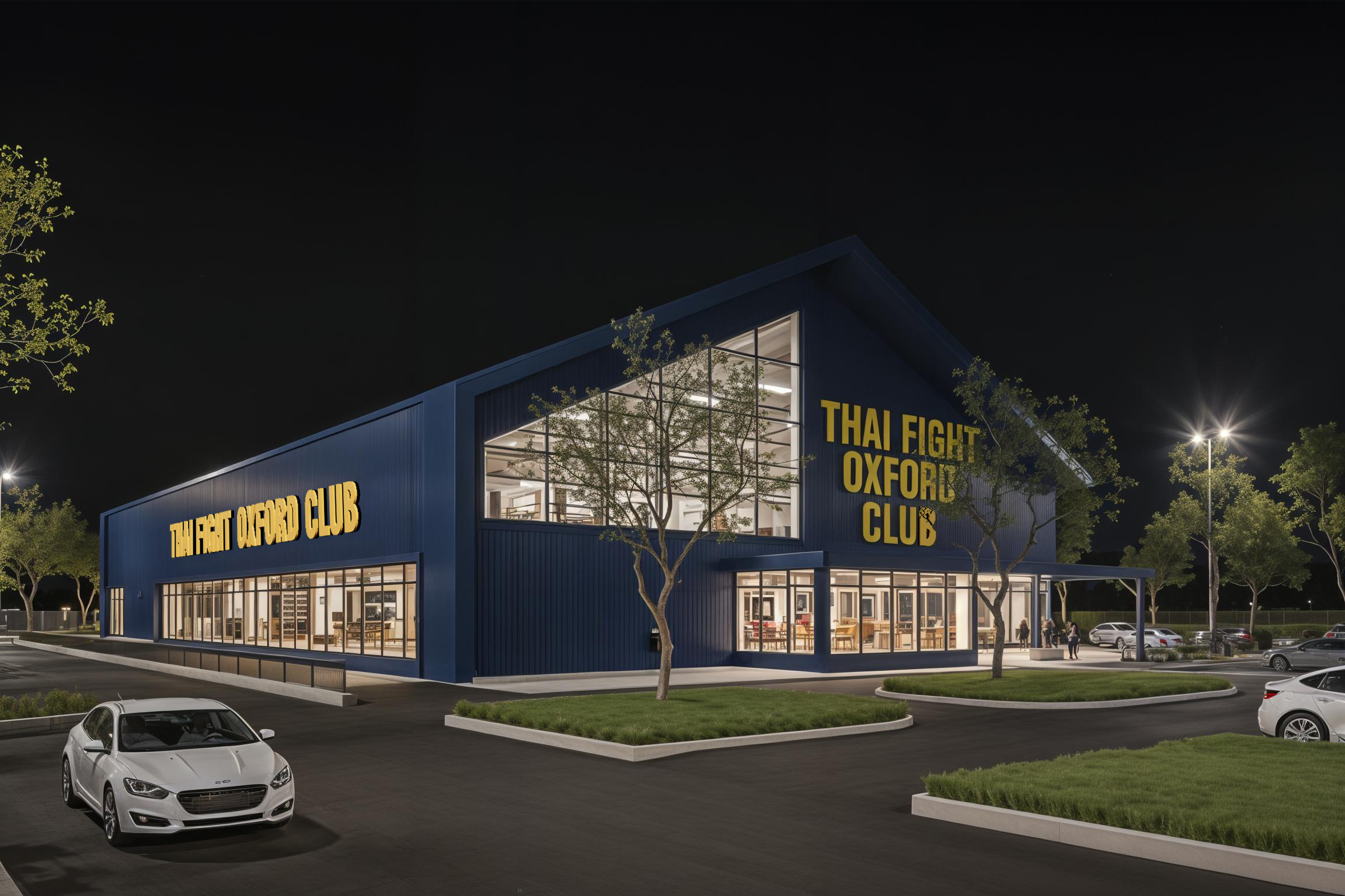 This Thai Fight Stadium and Fitness Complex is a high-energy "Industrial Arena" designed to broadcast its intensity to the street. Housed in a massive, warehouse-style structure, the facility adopts a bold new Corporate Identity of electric blue and vibrant yellow, creating a high-contrast visual landmark. The architectural core is defined by connectivity; the interior is an expansive, open-plan volume where the boxing ring, cardio zones, and commercial hubs are visually linked, allowing the "heartbeat" of the fight to pulse through the entire facility. The key attraction is the interconnection between the interior and the road. Expansive industrial glazing and oversized hangar doors allow commuters to perceive the kinetic energy of training from the exterior. This transparency transforms the building into a living billboard, where the drama of the stadium and the grit of the fitness center merge into a singular, seamless urban spectacle.