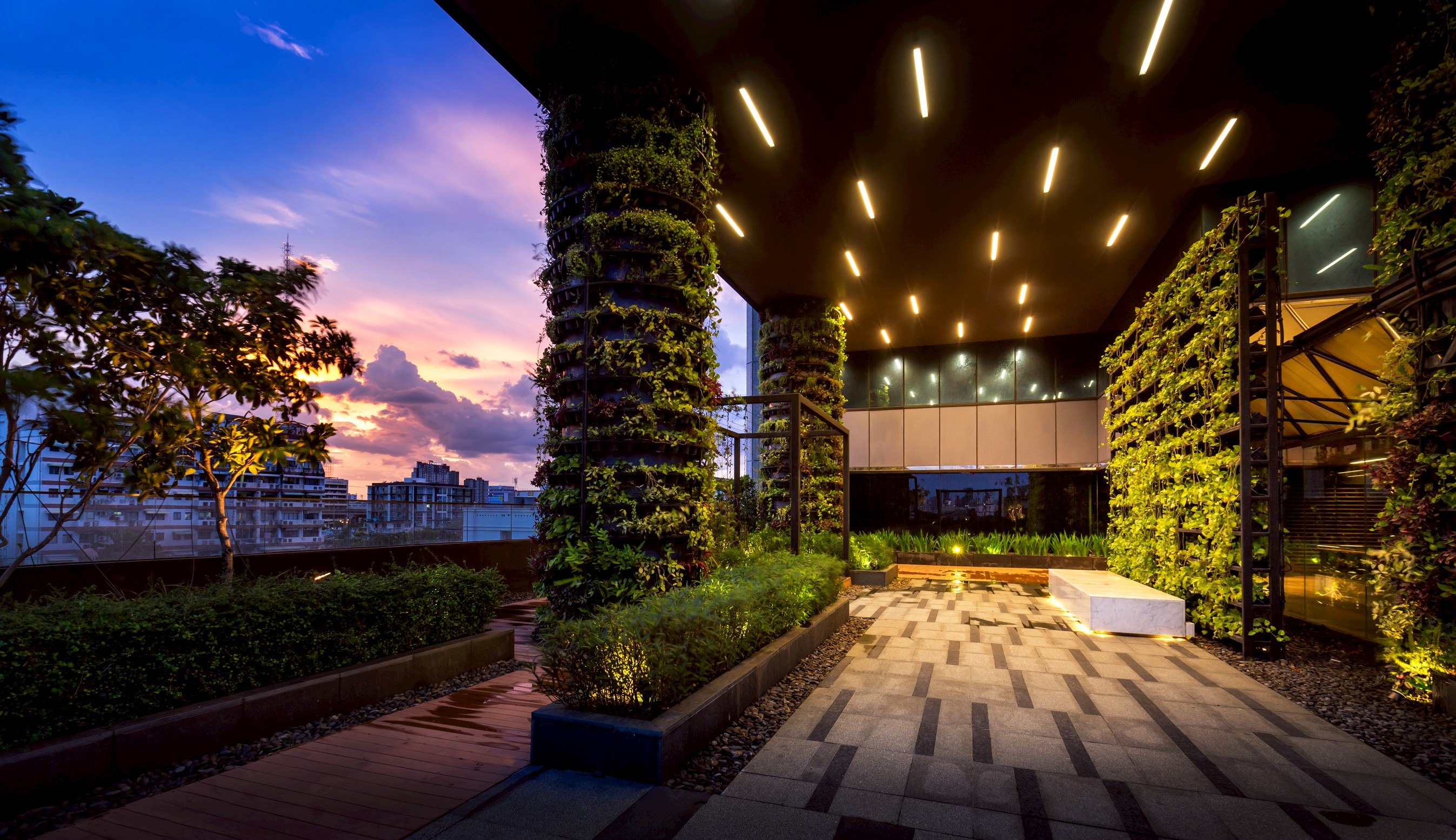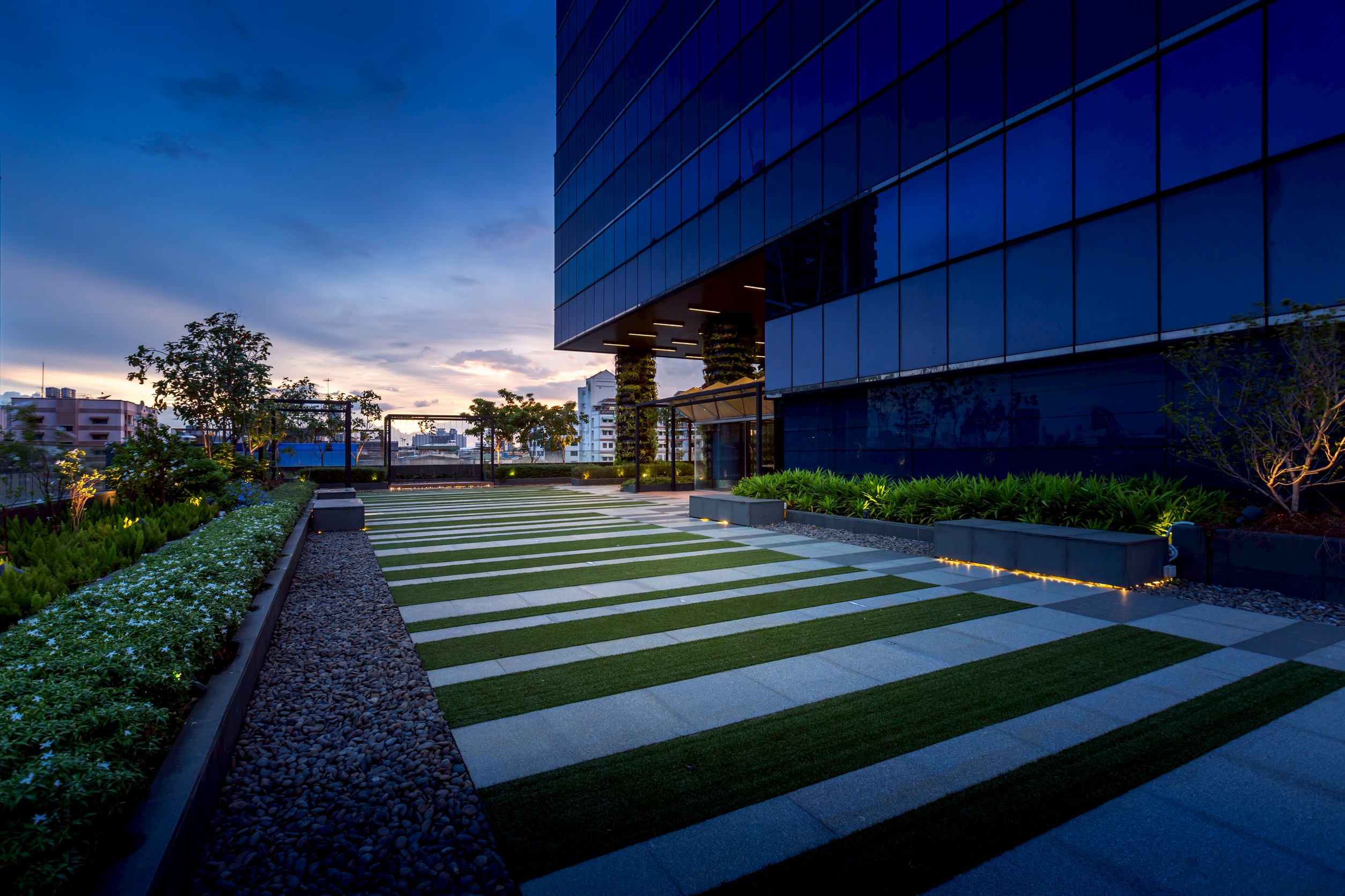 Revitalizing a forgotten abandoned rooftop, this design establishes a vibrant event and recreation space for the company. The transformation is anchored by nature, featuring biophilic columns wrapped in foliage, expansive green walls, and linear green strips that soften the industrial silhouette. The ground plane is defined by a playful lawn-Granite mixed floor, where hardscape and grass interlock in a random pattern to blur the boundary between garden and platform. Overhead, the lighting mirrors this spontaneity with a scattered, constellation-like arrangement, creating an immersive, organic atmosphere perfect for both corporate gatherings and daily casual escapes.