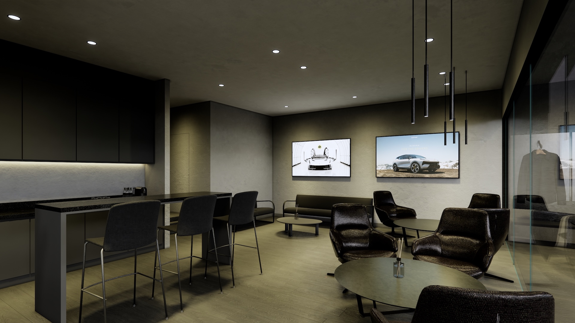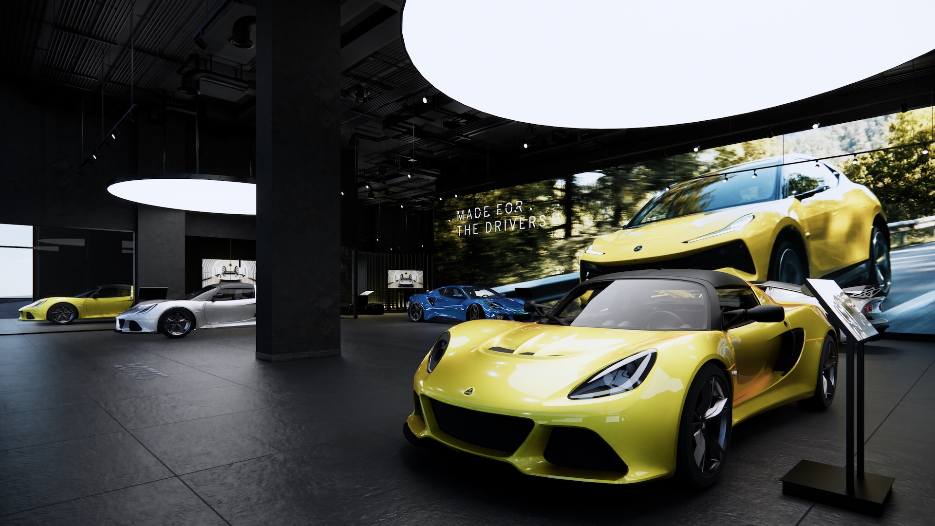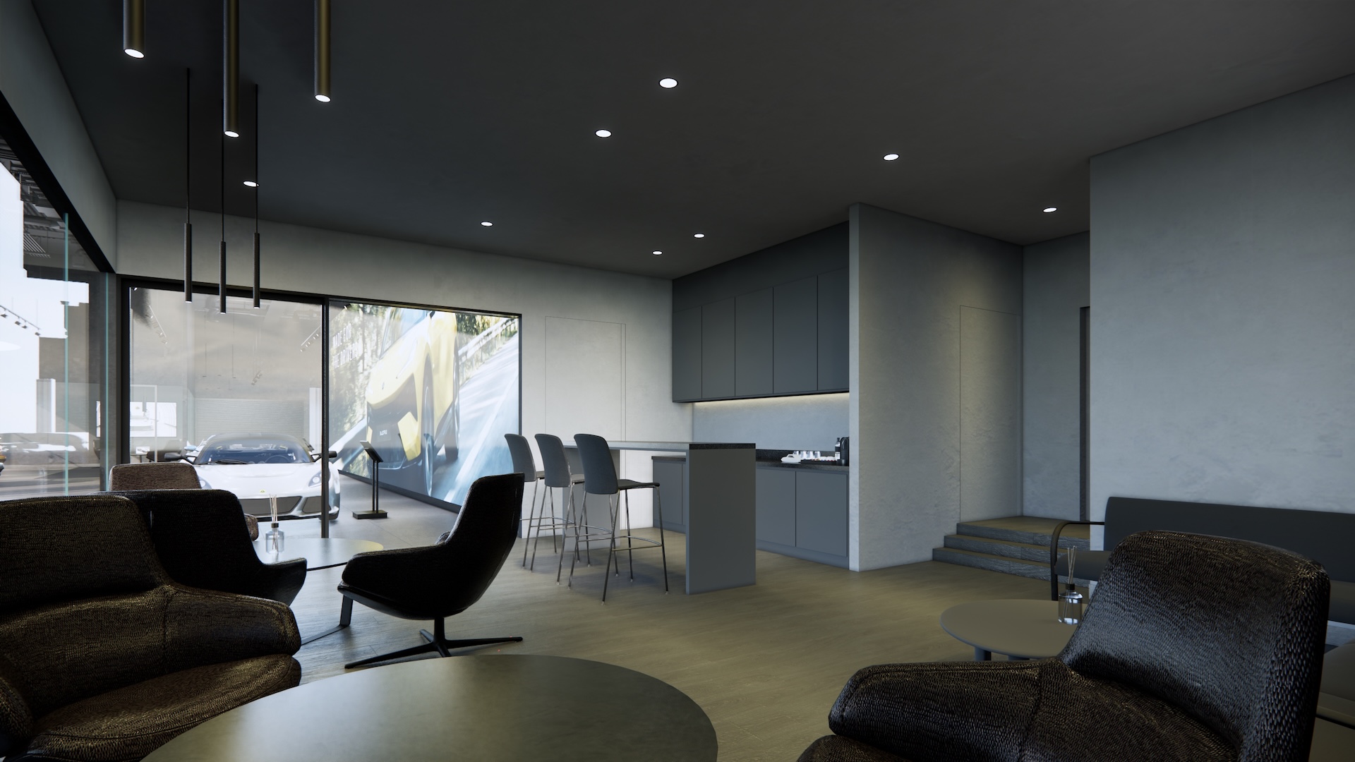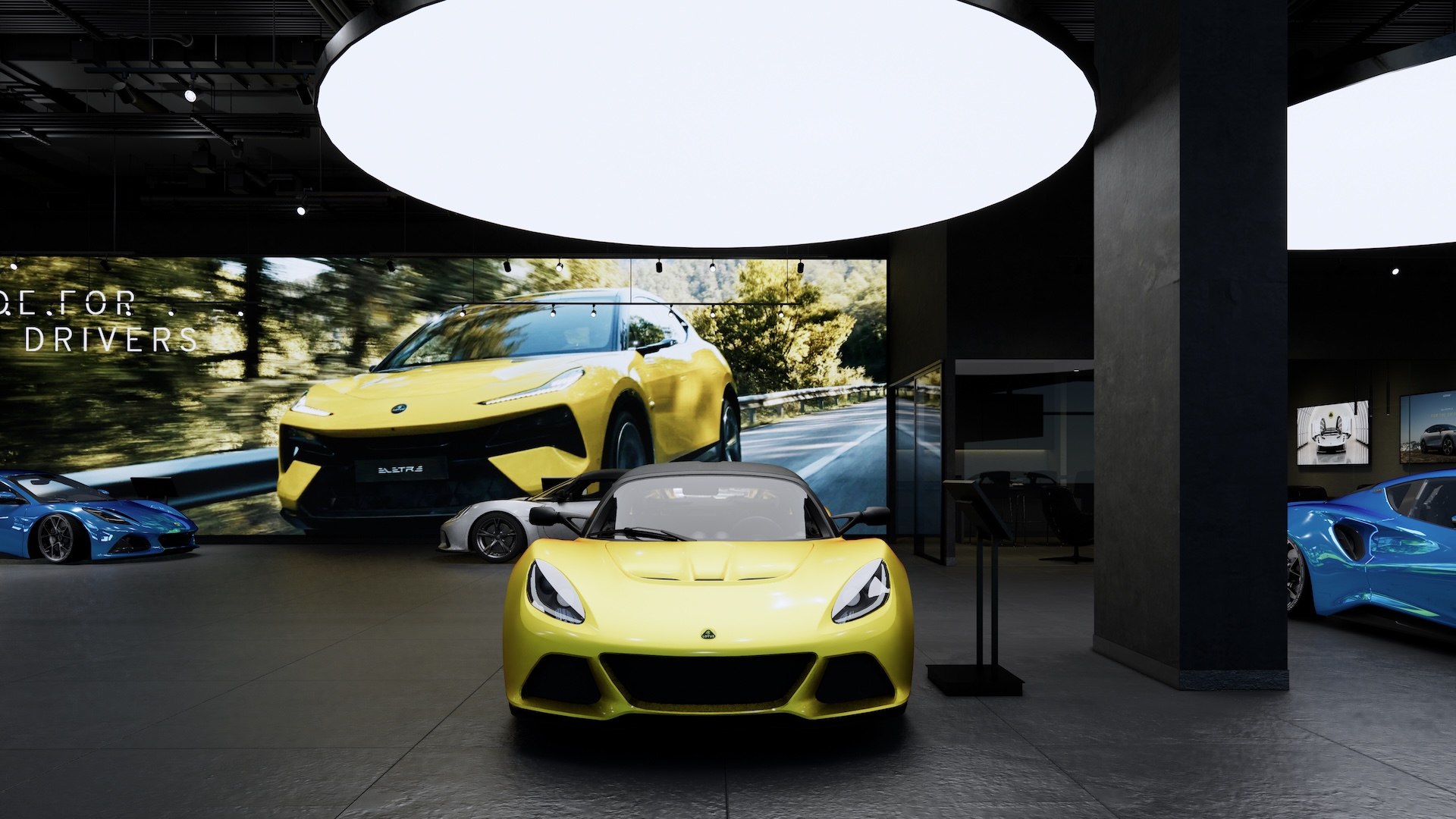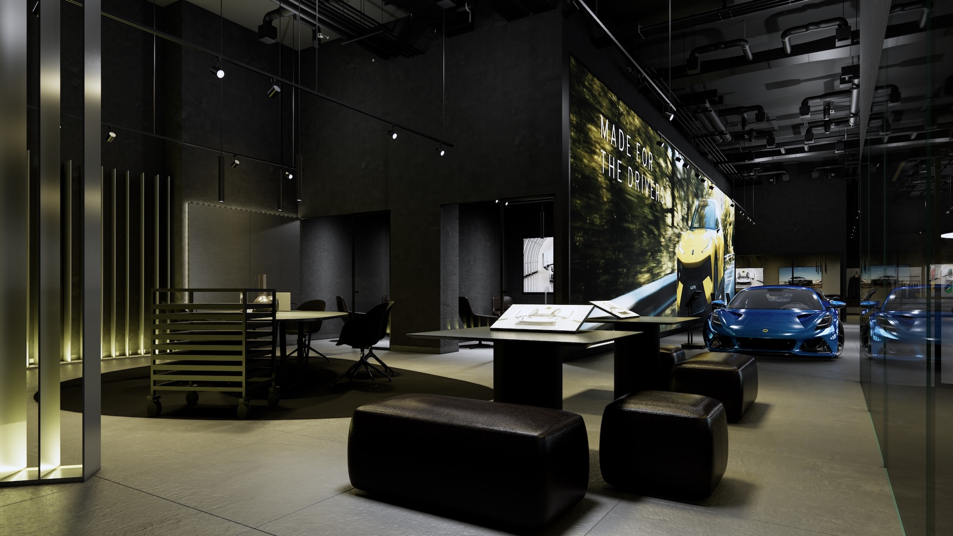 The Lotus Supercar Showroom and Service Center is a temple of aerodynamic speed, designed with a monolithic, black-glazed exterior. The minimalist architecture acts as a dark prism, featuring expansive smoked-glass facades that provide a tantalizing glimpse into the high-octane world within. By stripping away all visual noise, the structure embodies the Lotus philosophy of "lightness," using a midnight palette to create a sense of mystery and gravitational pull. Inside, the atmosphere is electric. Dramatic interior light panels and recessed LED arrays carve through the shadows, illuminating each supercar as a high-performance sculpture. These light "veins" emphasize the carbon-fiber curves and precision engineering of the vehicles, transforming the showroom into a dark gallery where the cars are the sole protagonists. It is a space defined by speed, shadows, and the stark beauty of illuminated power.