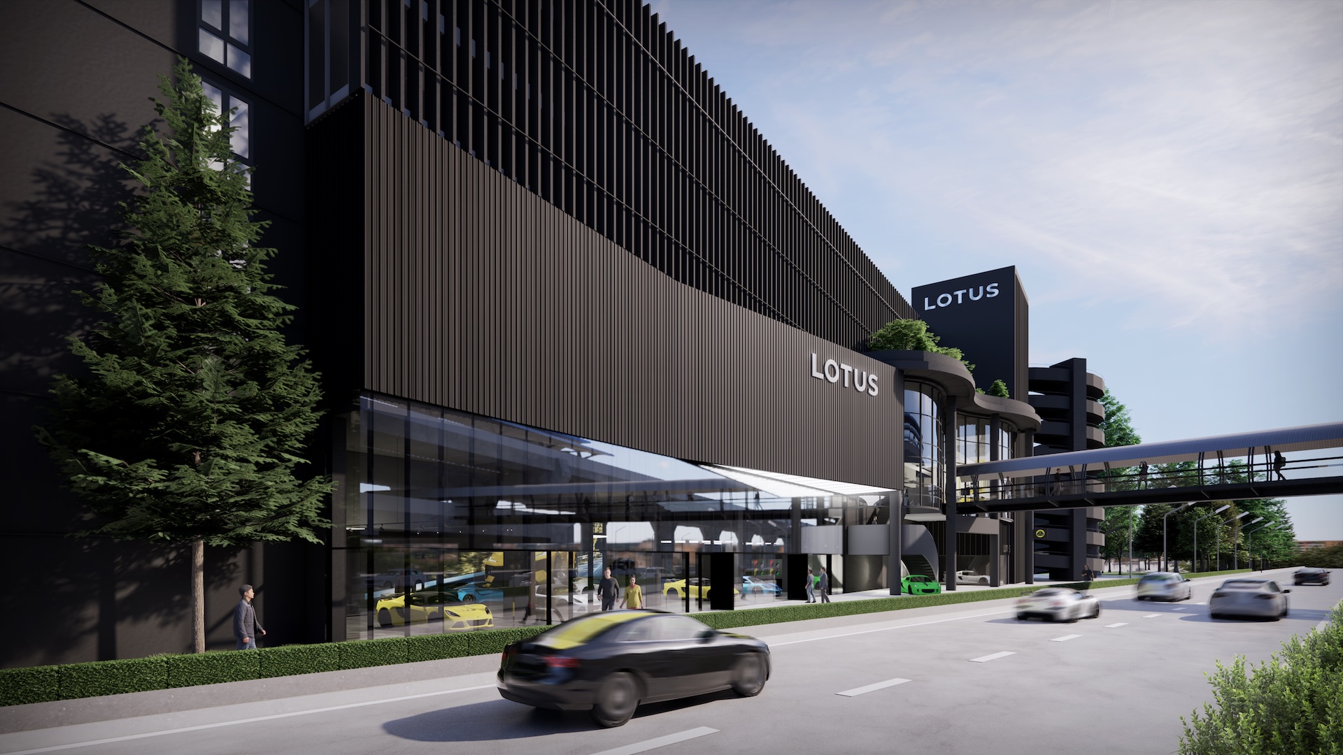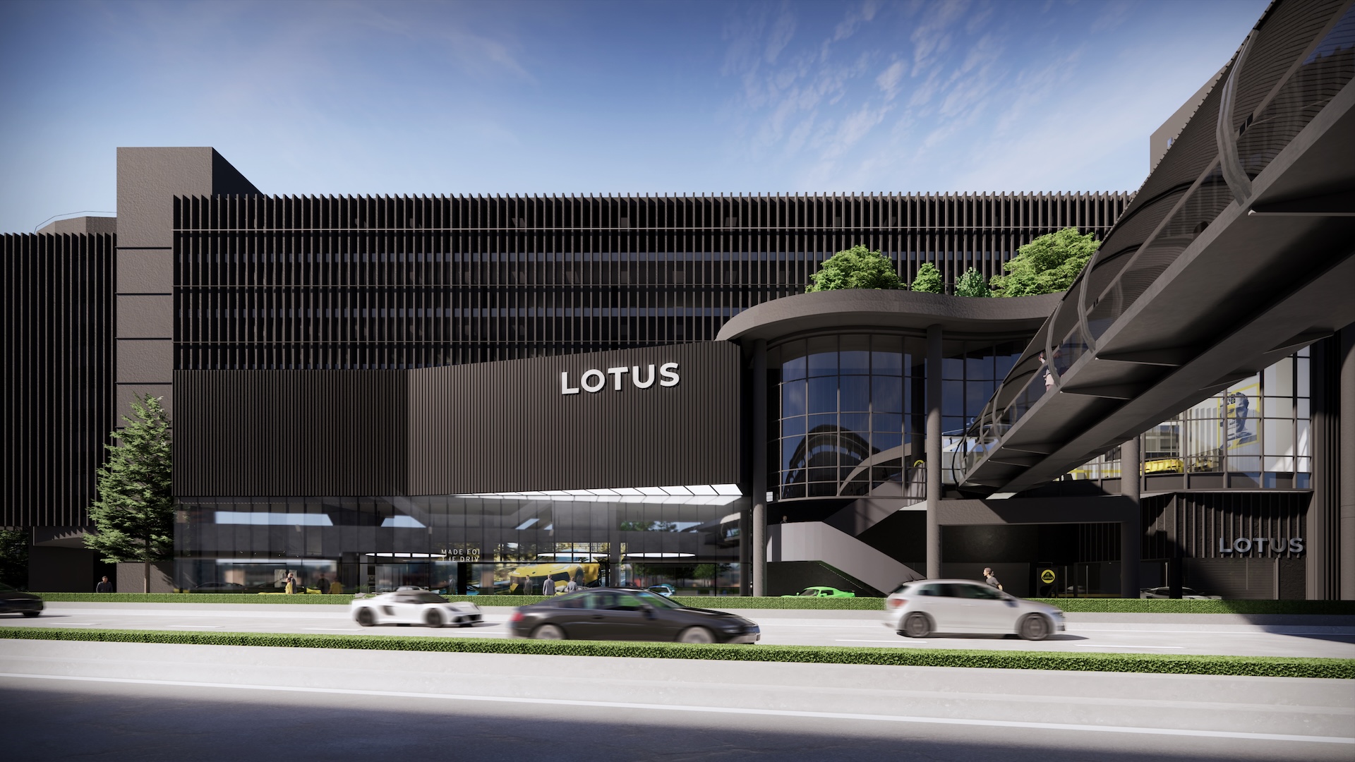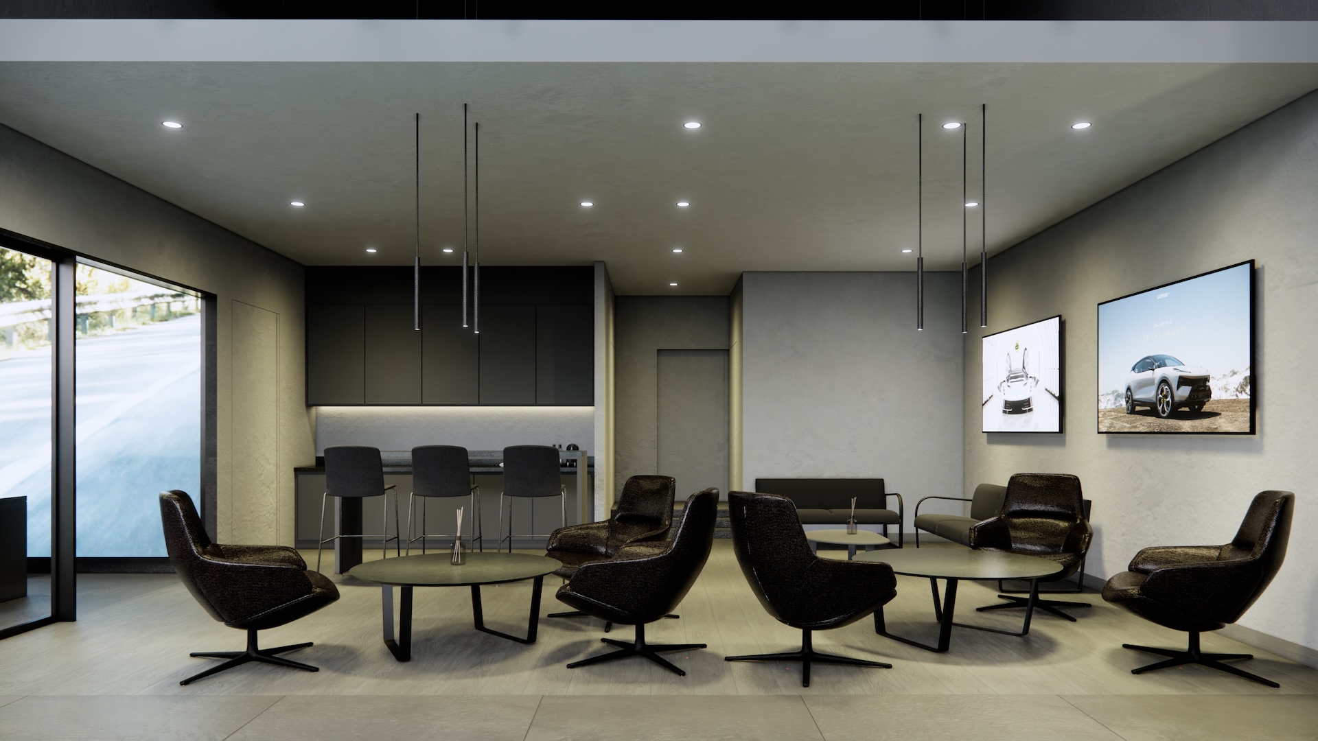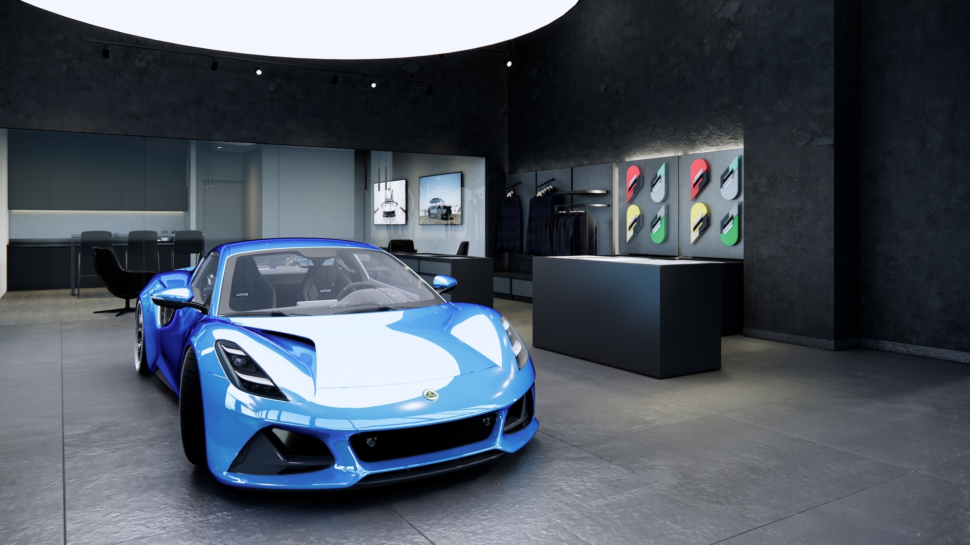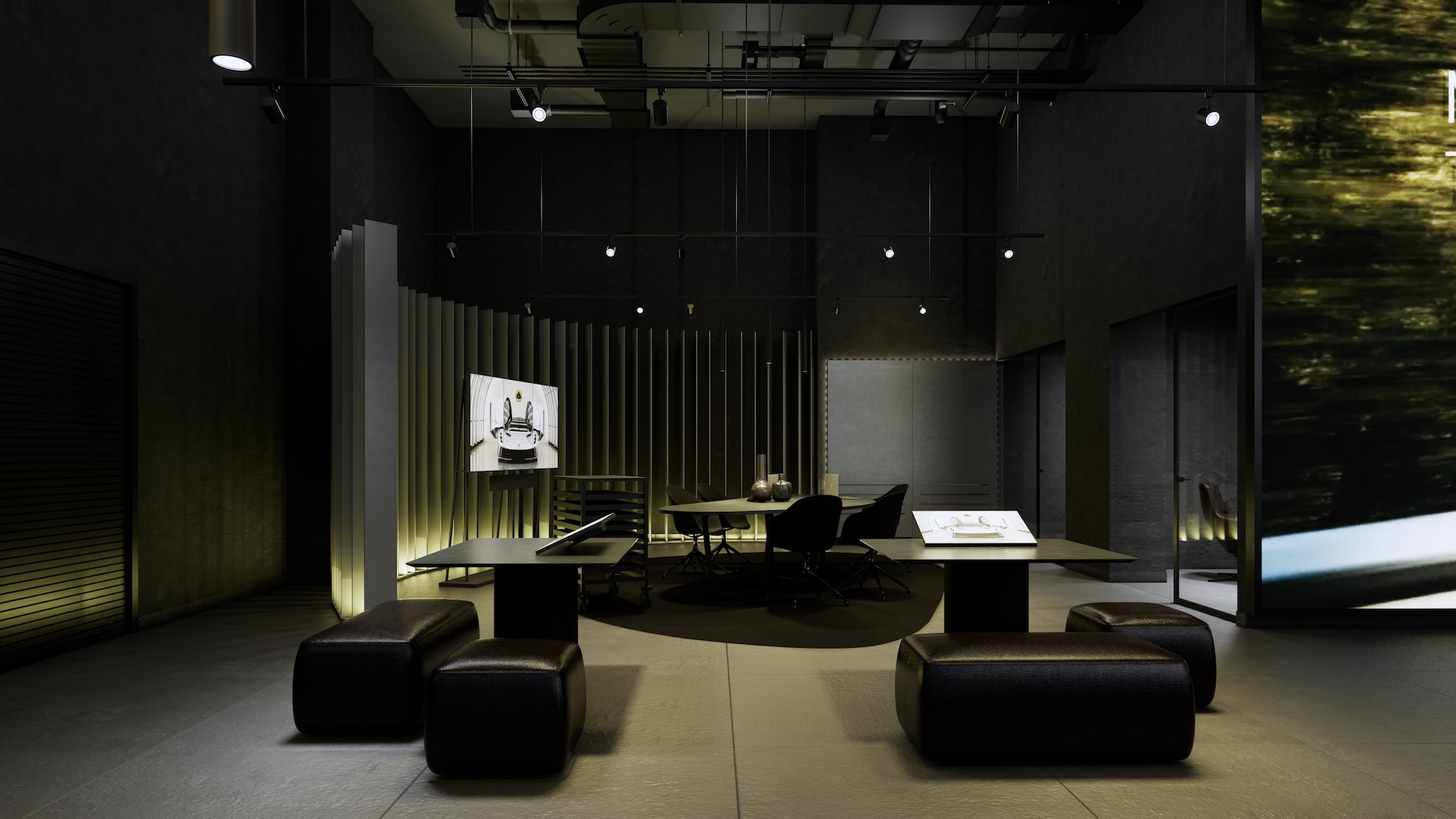 The Lotus Supercar Showroom and Service Center is a temple of aerodynamic speed, designed with a monolithic, black-glazed exterior. The minimalist architecture acts as a dark prism, featuring expansive smoked-glass facades that provide a tantalizing glimpse into the high-octane world within. By stripping away all visual noise, the structure embodies the Lotus philosophy of "lightness," using a midnight palette to create a sense of mystery and gravitational pull. Inside, the atmosphere is electric. Dramatic interior light panels and recessed LED arrays carve through the shadows, illuminating each supercar as a high-performance sculpture. These light "veins" emphasize the carbon-fiber curves and precision engineering of the vehicles, transforming the showroom into a dark gallery where the cars are the sole protagonists. It is a space defined by speed, shadows, and the stark beauty of illuminated power.