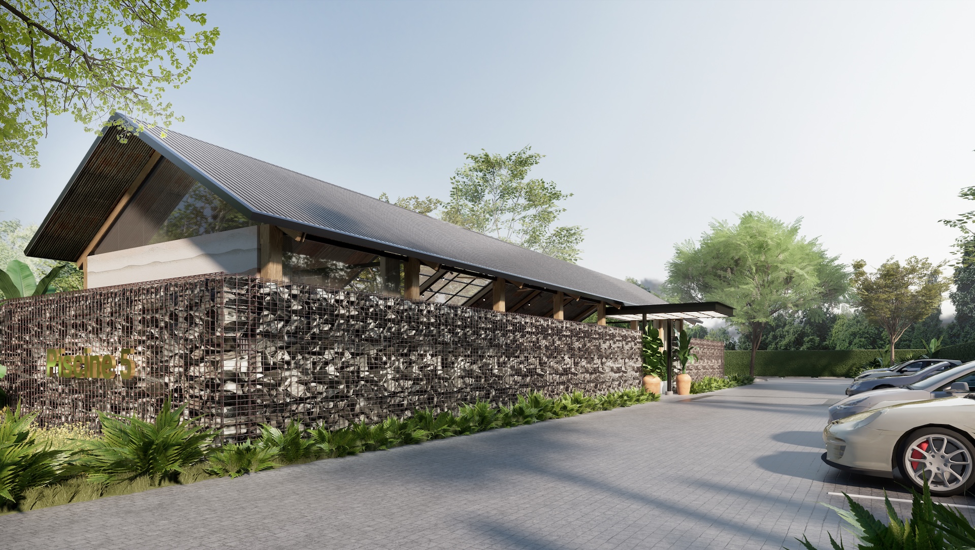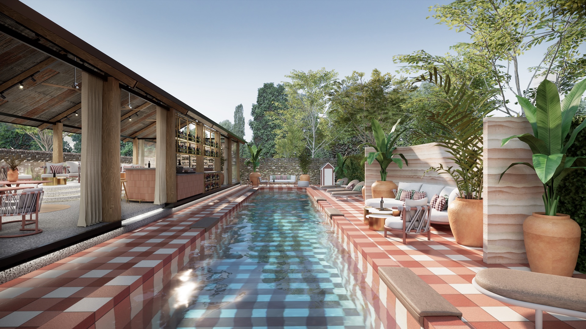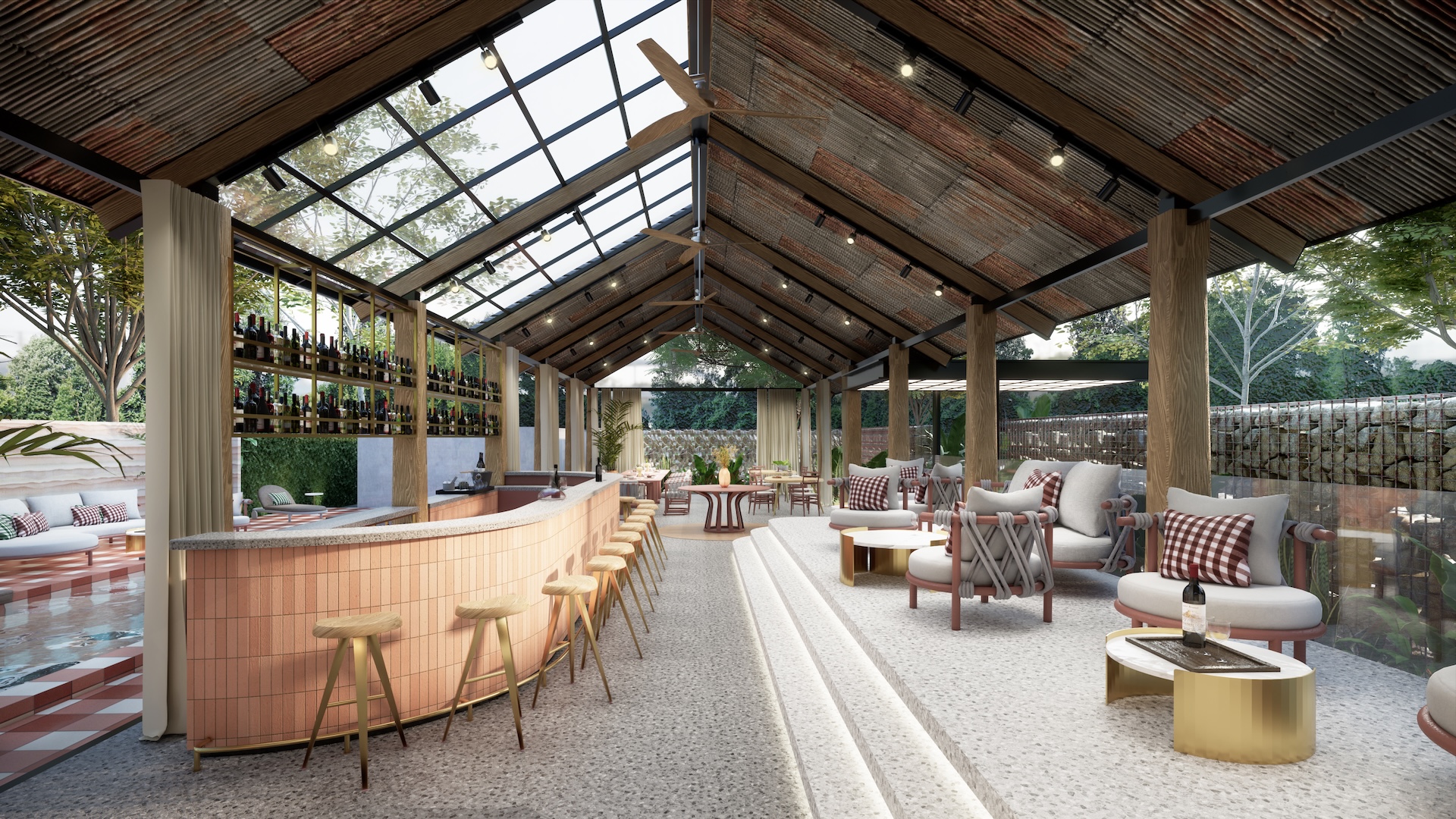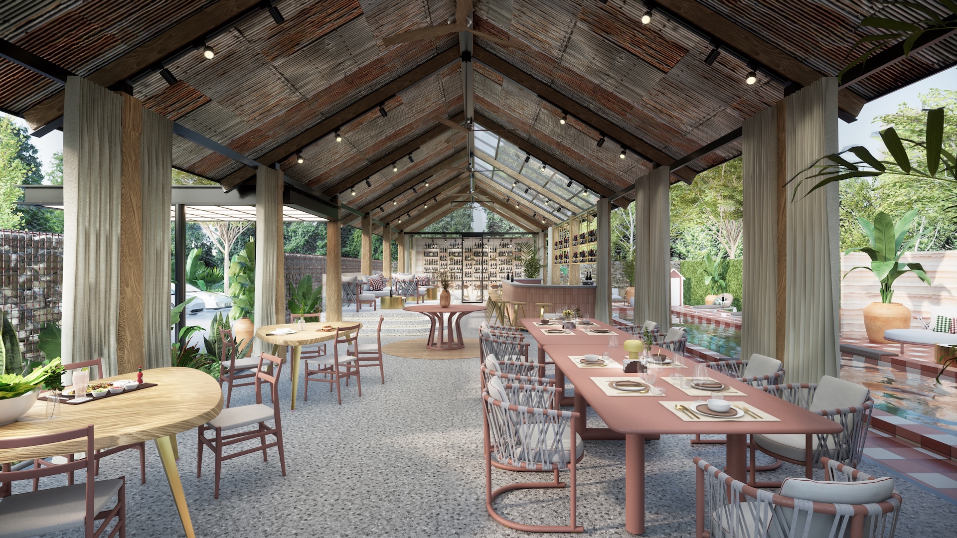 This urban beach club is a bold exercise in tropical Brutalism, where the raw power of monolithic concrete meets the high-octane energy of a coastal escape. The architecture features concrete cube wall in rebar frame, massive, modern-shaped thatch and overhanging wood beams that provide dramatic contrast material aspect over the pool deck. This "grey canvas" is vibrantly interrupted by colorful tropical accents—electric corals, deep teals, and lush exotic palms—creating a high-contrast visual feast that feels both prehistoric and avant-garde. The lounge areas are curated with outdoor modern Italian furniture, featuring sleek, low-slung silhouettes and perforated metal frames that add a layer of European refinement to the rugged surroundings. It is a sophisticated playground where the "honesty" of raw masonry meets the playful luxury of a Mediterranean summer, redefining the beach club as a structural masterpiece.