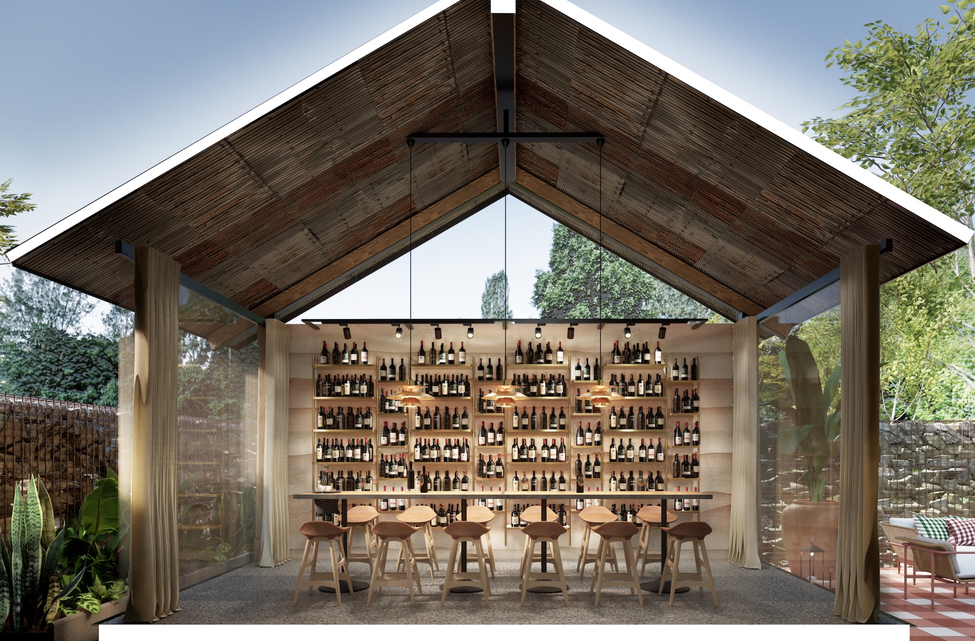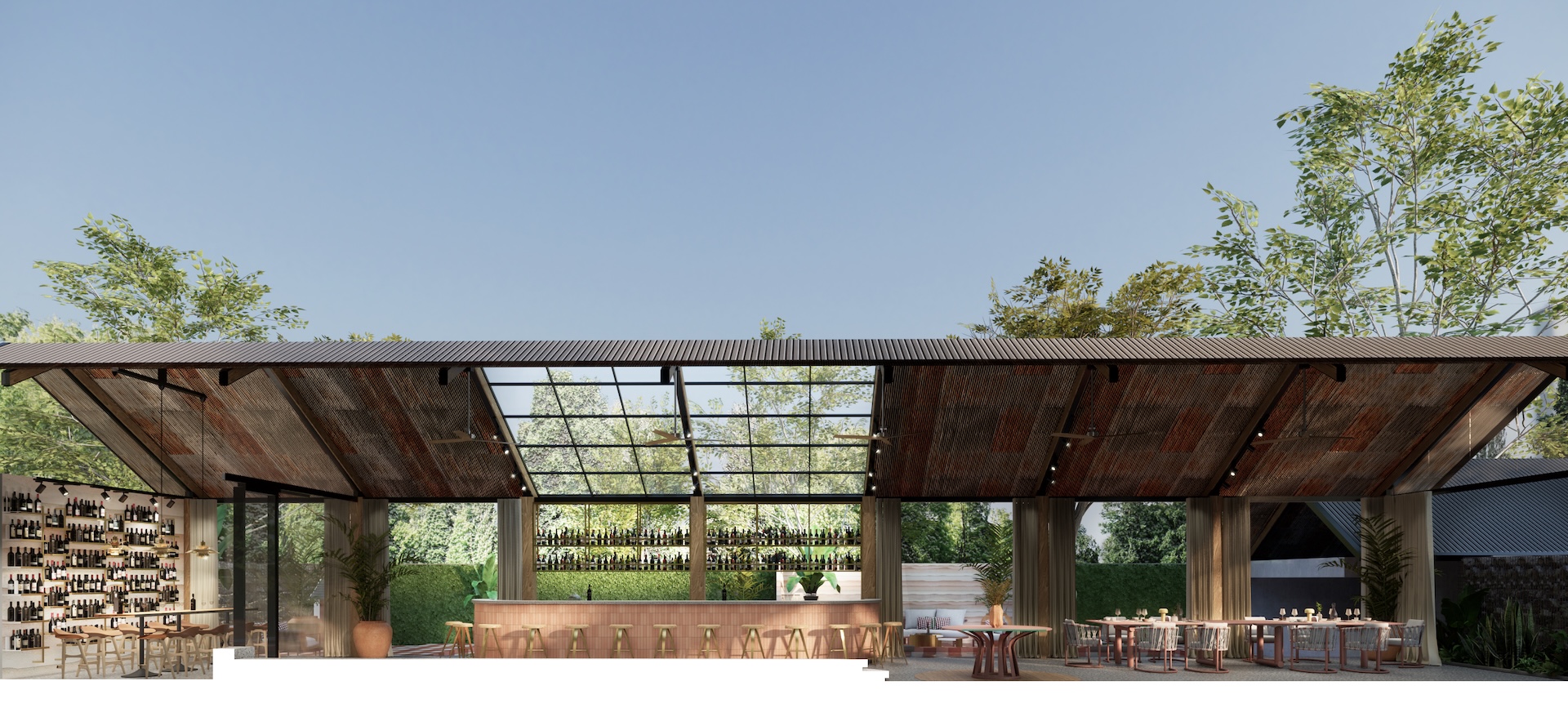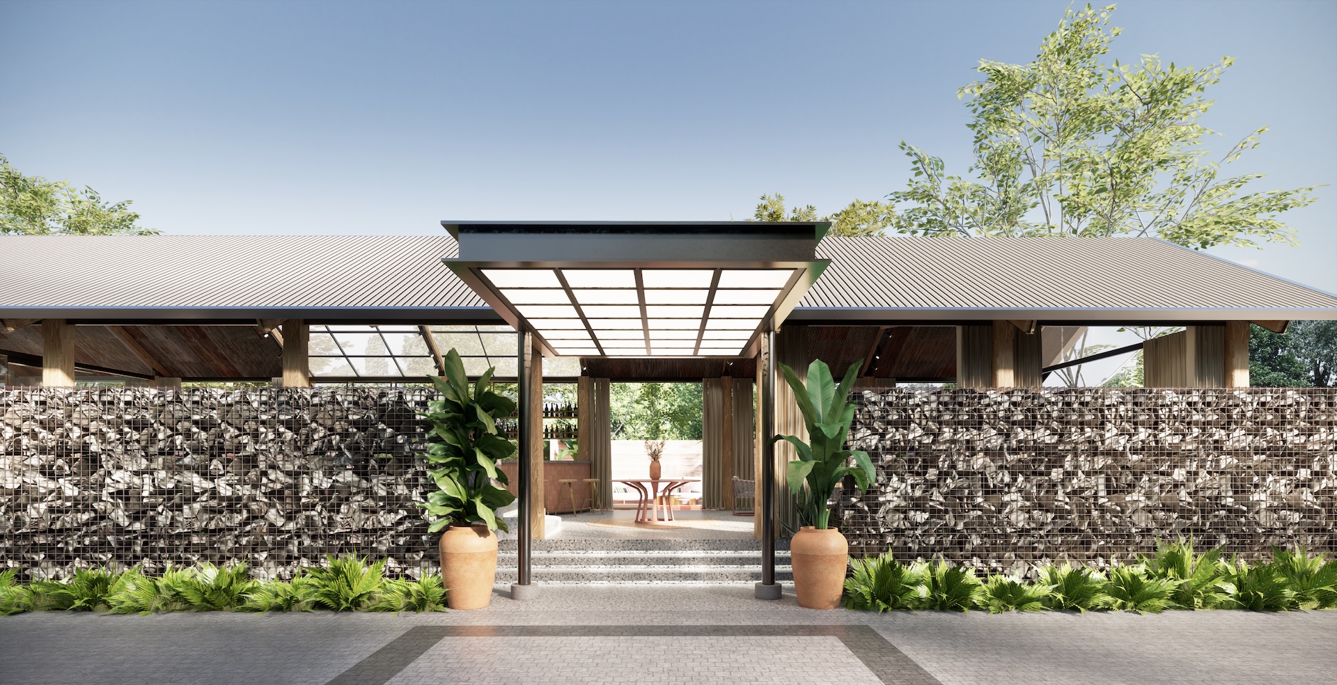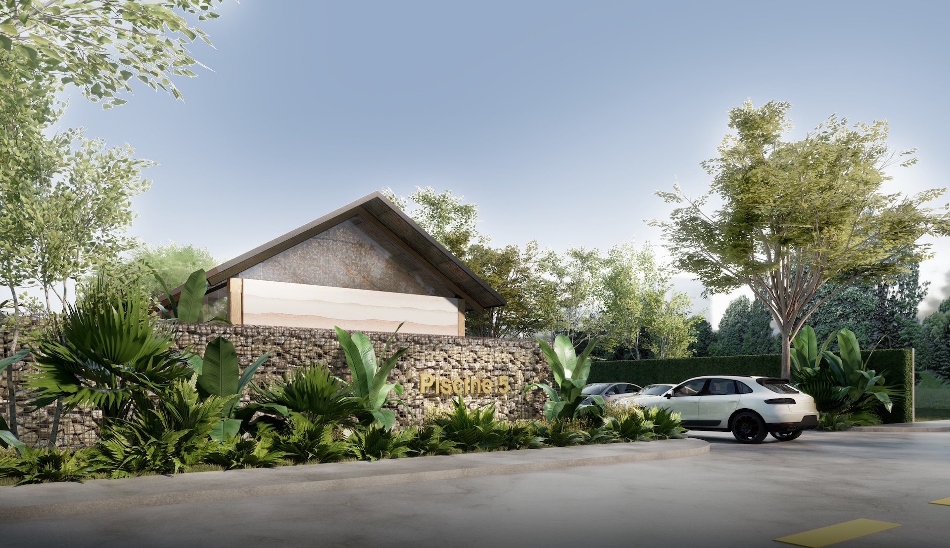 This urban beach club is a bold exercise in tropical Brutalism, where the raw power of monolithic concrete meets the high-octane energy of a coastal escape. The architecture features concrete cube wall in rebar frame, massive, modern-shaped thatch and overhanging wood beams that provide dramatic contrast material aspect over the pool deck. This "grey canvas" is vibrantly interrupted by colorful tropical accents—electric corals, deep teals, and lush exotic palms—creating a high-contrast visual feast that feels both prehistoric and avant-garde. The lounge areas are curated with outdoor modern Italian furniture, featuring sleek, low-slung silhouettes and perforated metal frames that add a layer of European refinement to the rugged surroundings. It is a sophisticated playground where the "honesty" of raw masonry meets the playful luxury of a Mediterranean summer, redefining the beach club as a structural masterpiece.