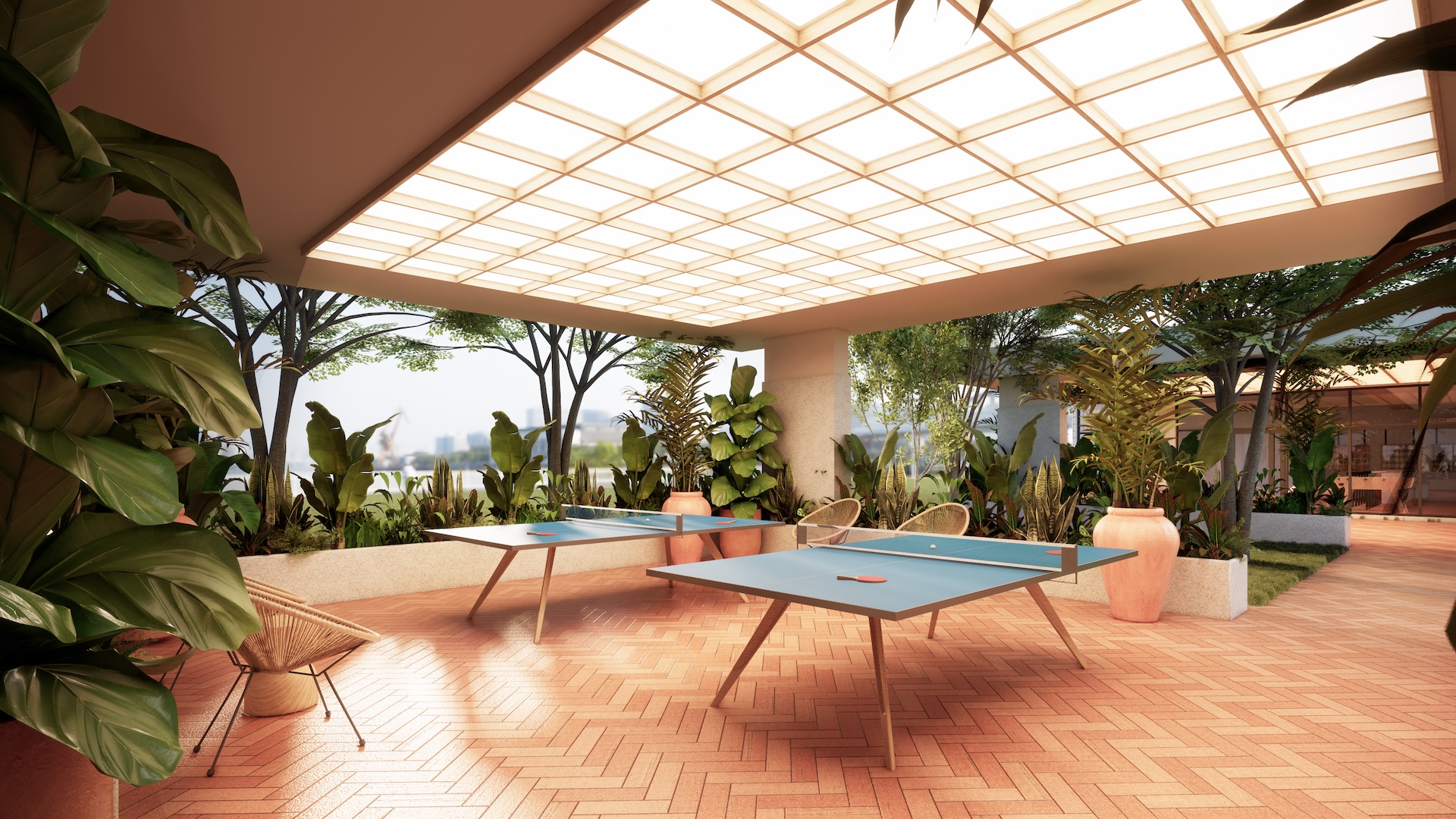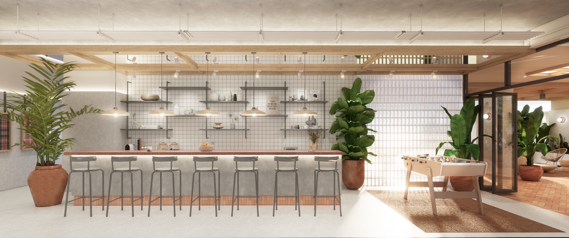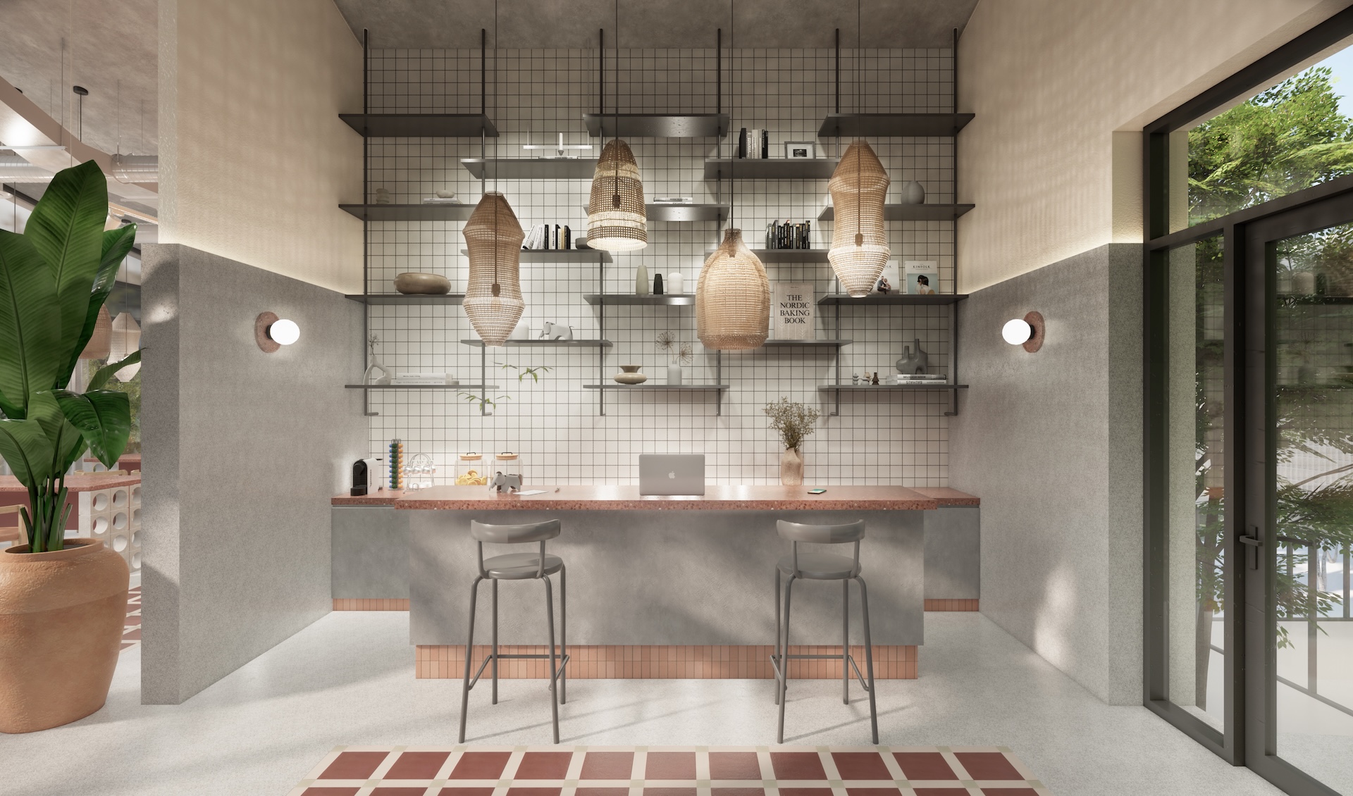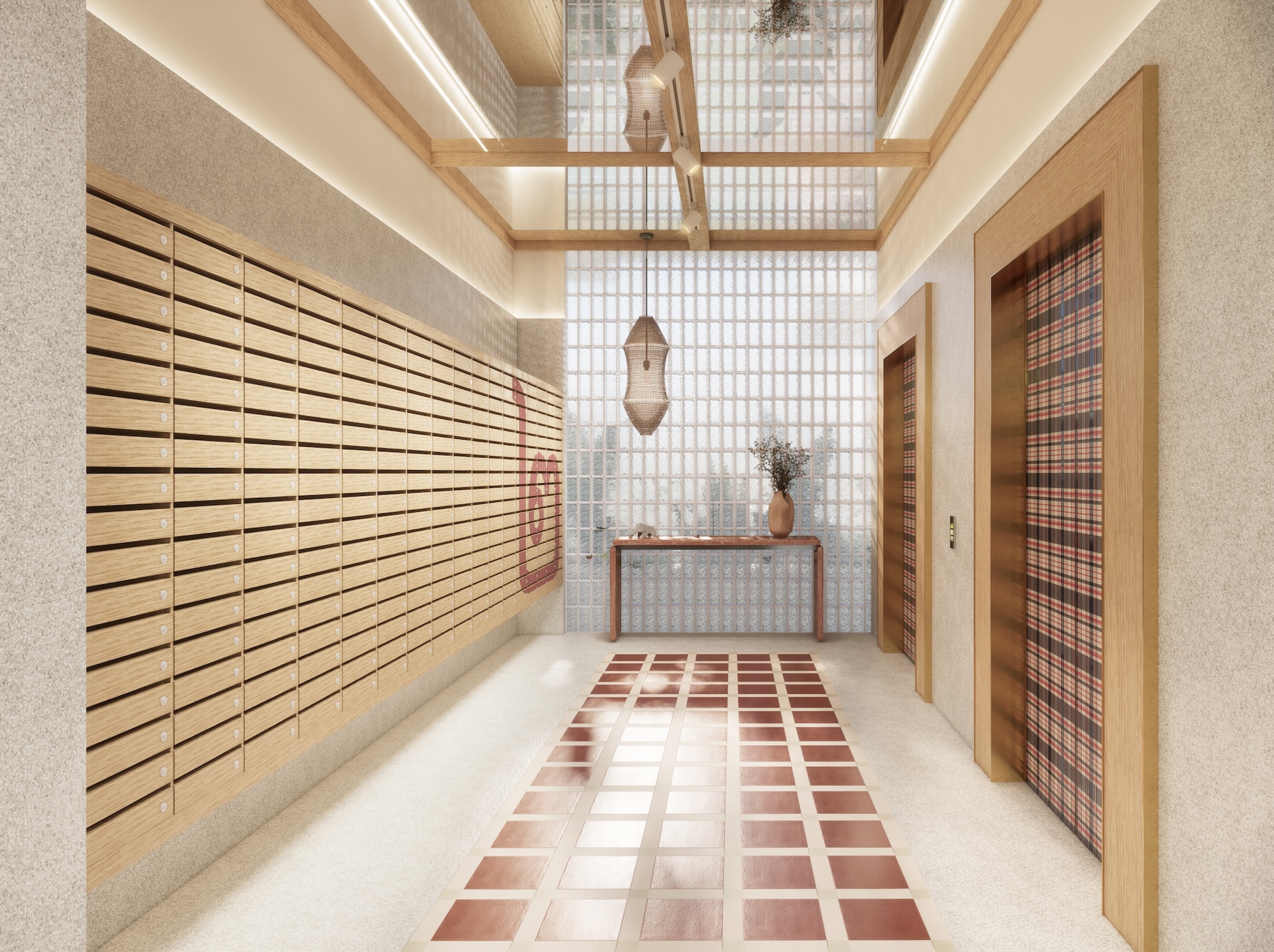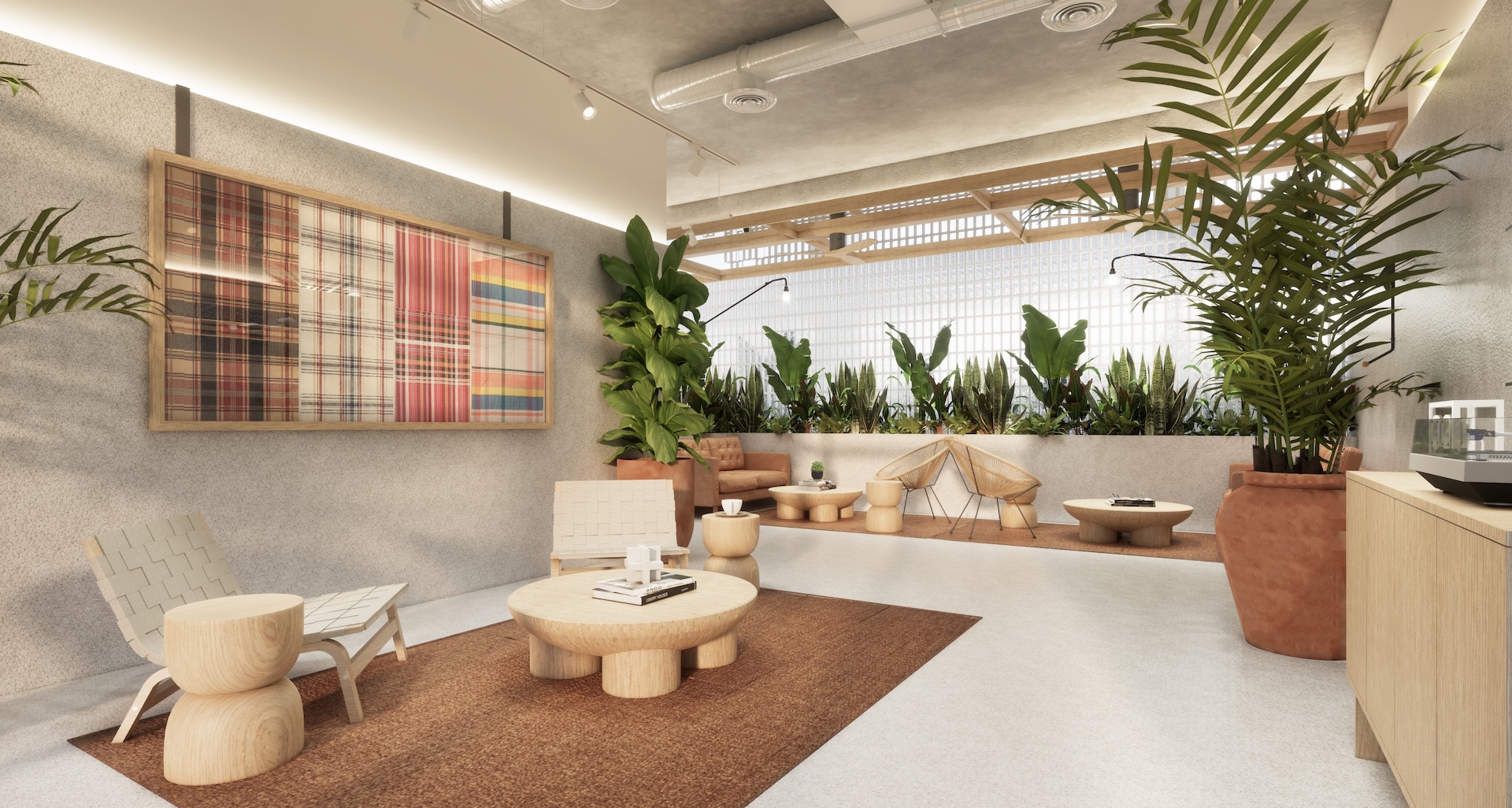 This multi-residential condominium is a poetic reimagining of Brutalism, where raw, monolithic concrete volumes are softened by a delicate pastel-toned finish. The architecture’s "heavy" geometry is neutralized by a palette of dusty rose and pale sage, creating a "soft-tectonic" aesthetic. The interiors embrace Minimalist Mid-Century styling—clean-lined walnut furniture and tapered silhouettes—to maintain a sense of airy sophistication within the rugged structure. True to its soul, the project integrates biophilic design, with cascading flora that spills over concrete balconies like "living lace." A unique cultural anchor is the usage of the Thai Tartan (Pha Khao Ma) pattern; this traditional weave is reimagined as oversized, minimalist art installations and textile partitions, adding a vibrant, rhythmic soul to the common areas. It is a space where industrial honesty, retro grace, and Thai heritage converge in a lush, chromatic sanctuary.