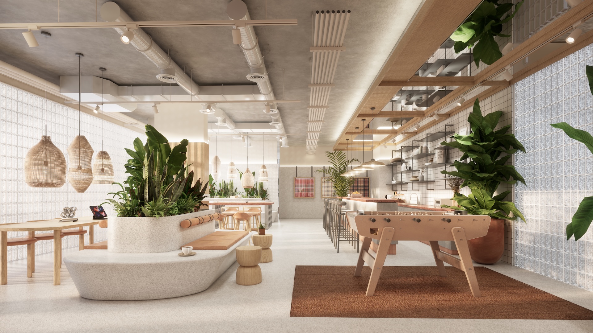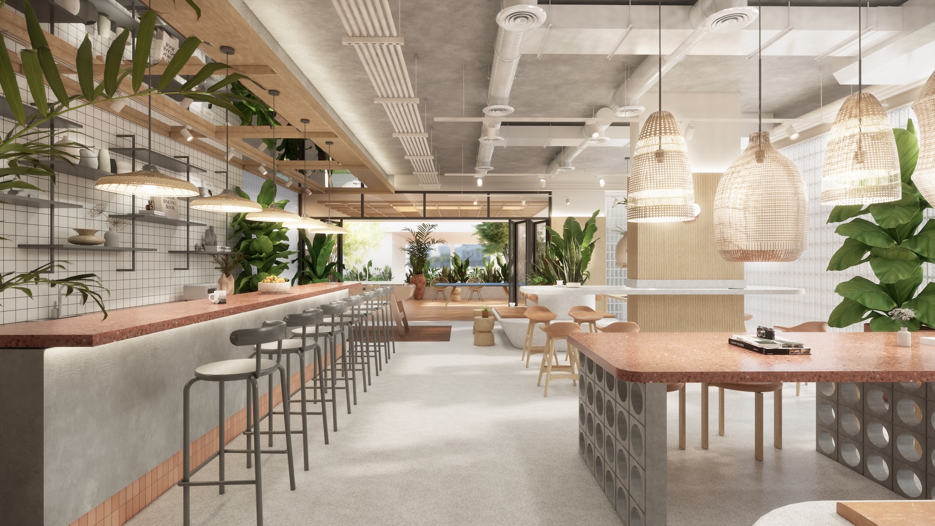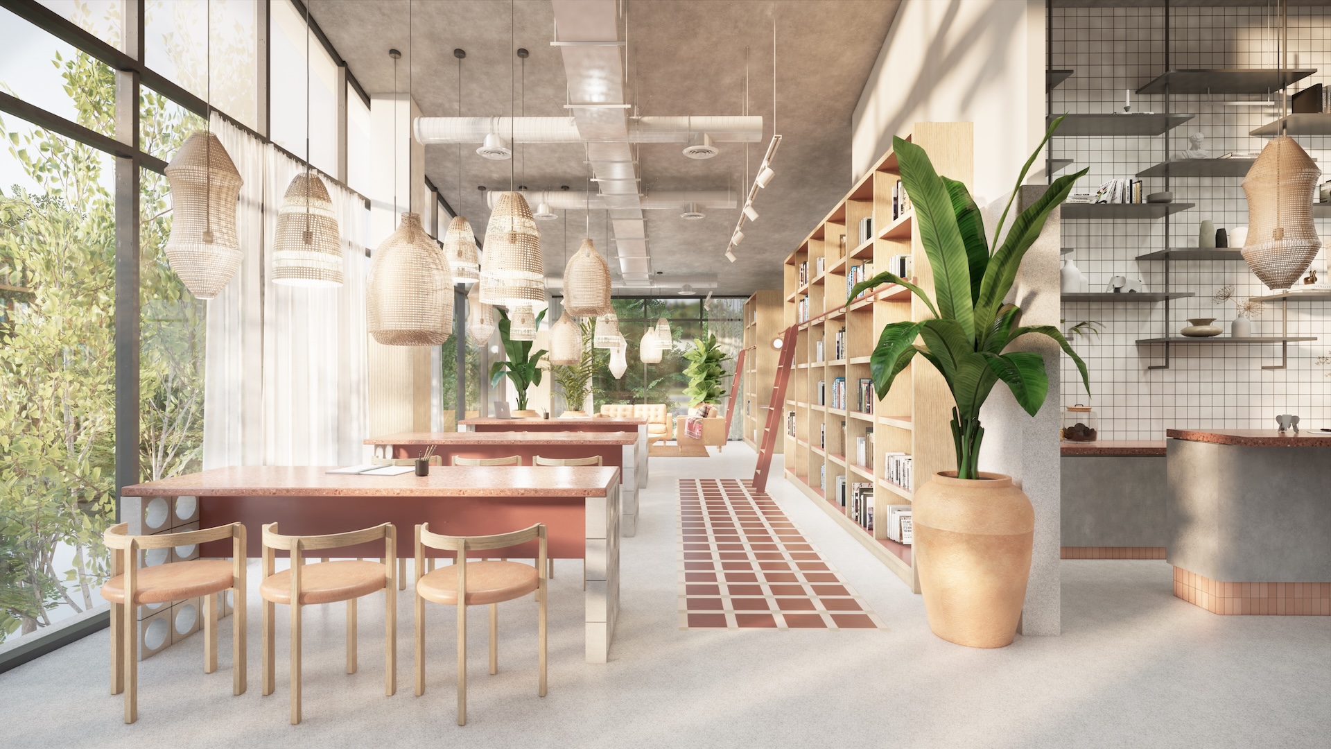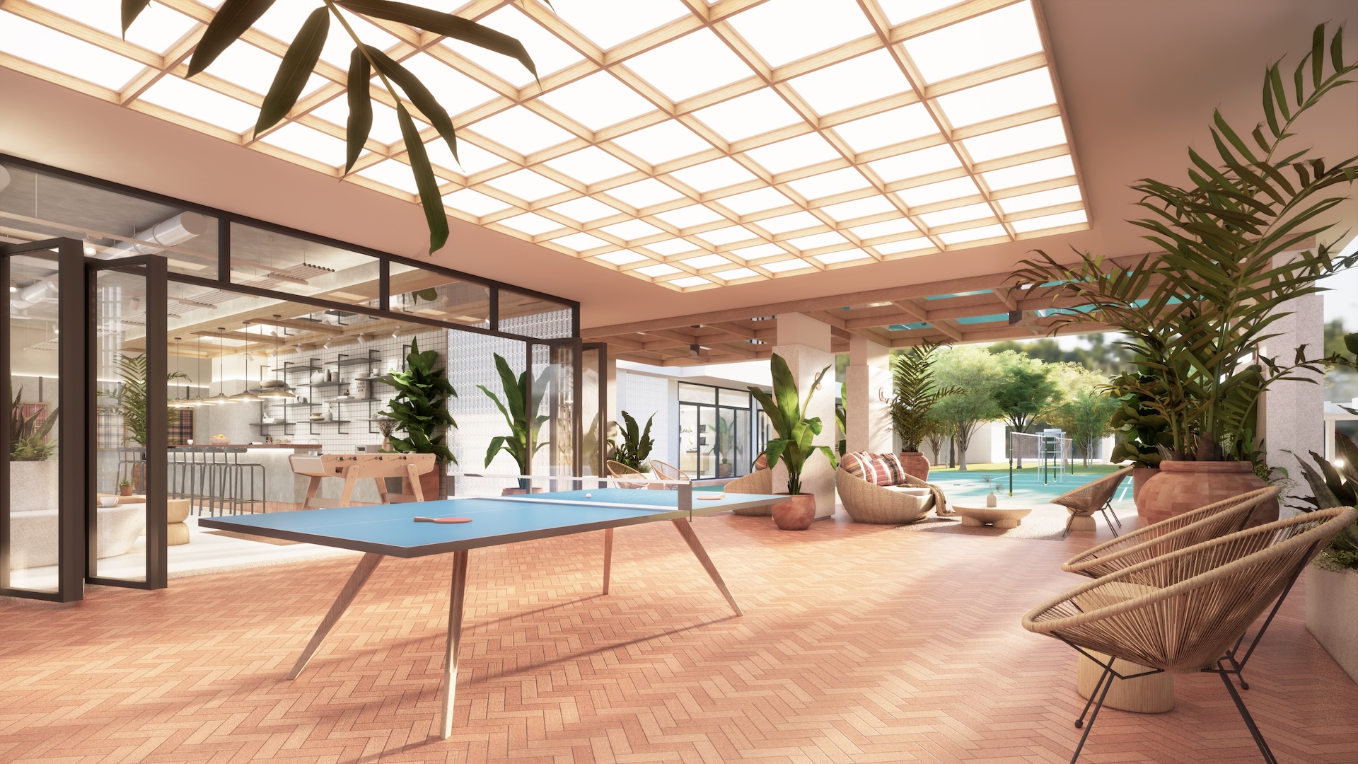 This multi-residential condominium is a poetic reimagining of Brutalism, where raw, monolithic concrete volumes are softened by a delicate pastel-toned finish. The architecture’s "heavy" geometry is neutralized by a palette of dusty rose and pale sage, creating a "soft-tectonic" aesthetic. The interiors embrace Minimalist Mid-Century styling—clean-lined walnut furniture and tapered silhouettes—to maintain a sense of airy sophistication within the rugged structure. True to its soul, the project integrates biophilic design, with cascading flora that spills over concrete balconies like "living lace." A unique cultural anchor is the usage of the Thai Tartan (Pha Khao Ma) pattern; this traditional weave is reimagined as oversized, minimalist art installations and textile partitions, adding a vibrant, rhythmic soul to the common areas. It is a space where industrial honesty, retro grace, and Thai heritage converge in a lush, chromatic sanctuary.