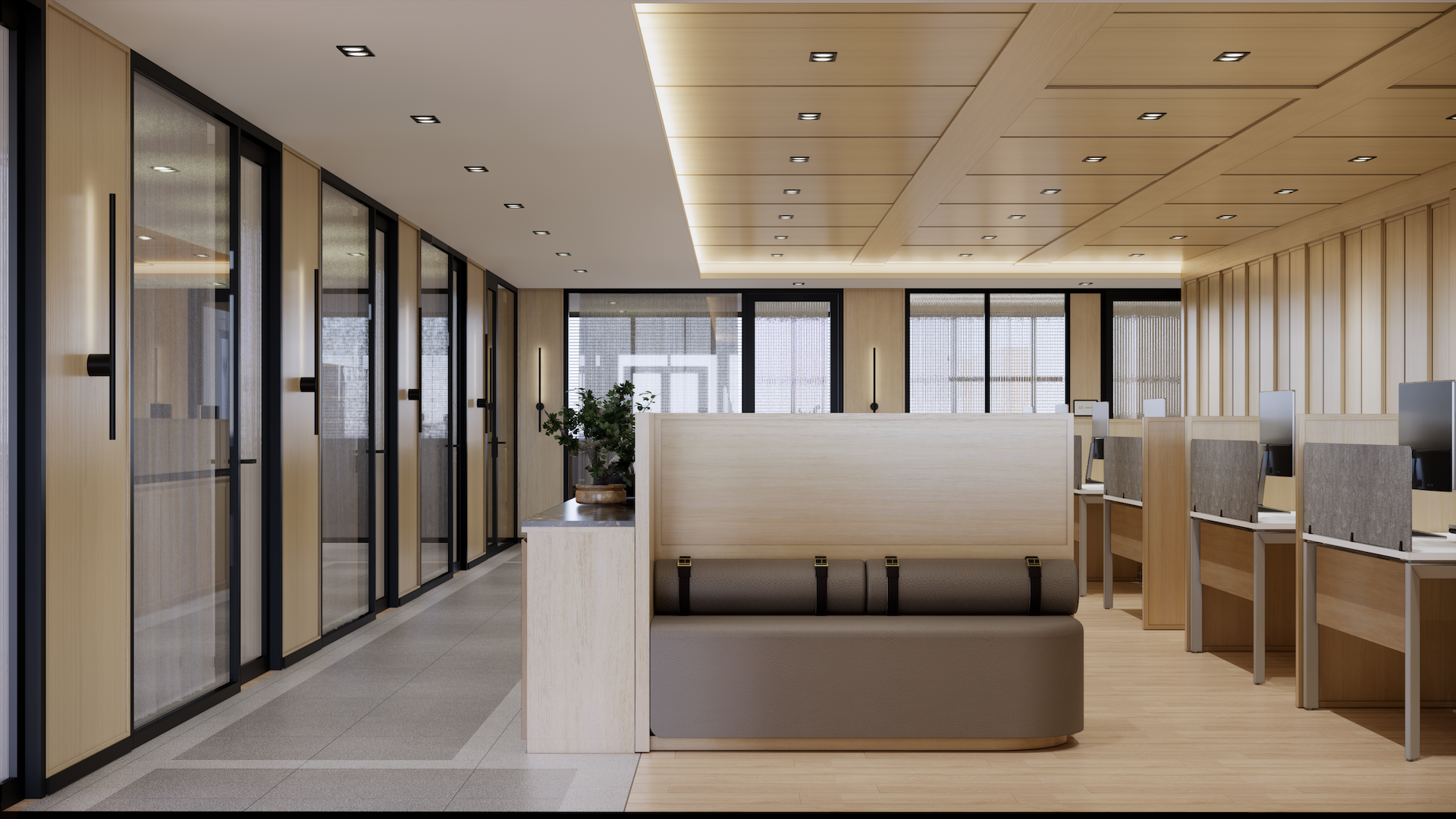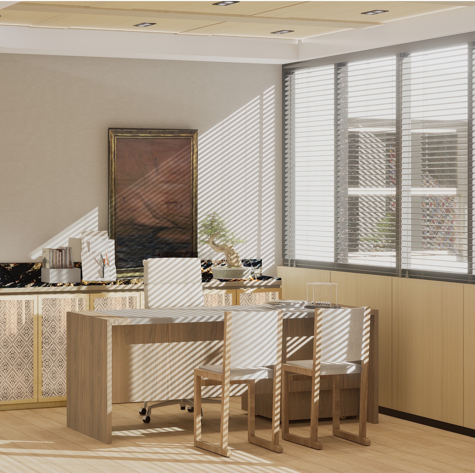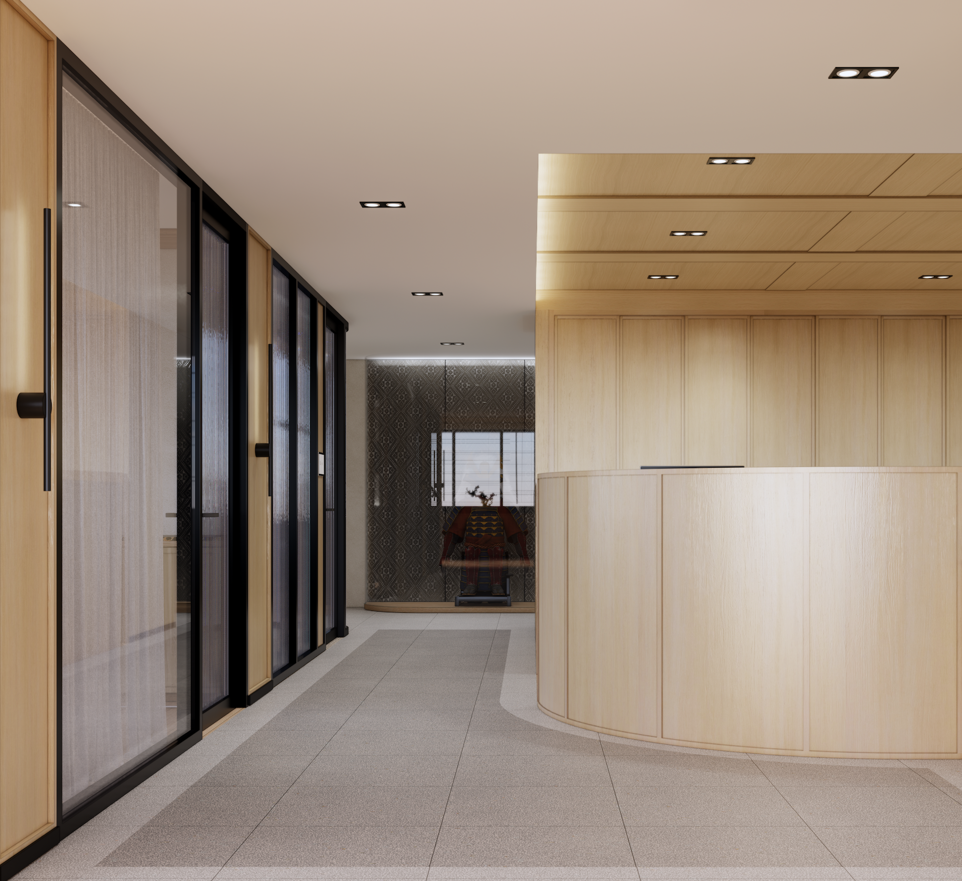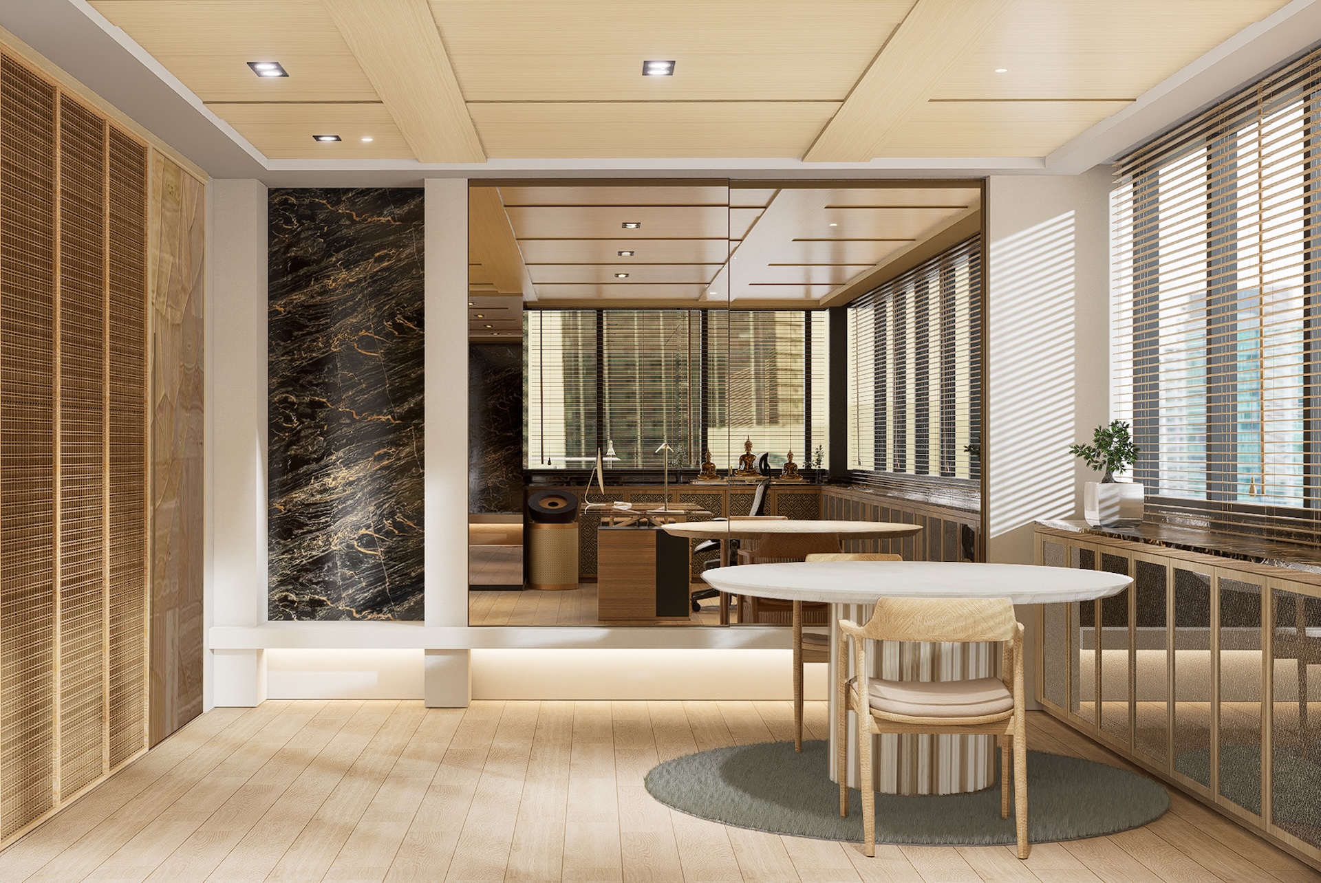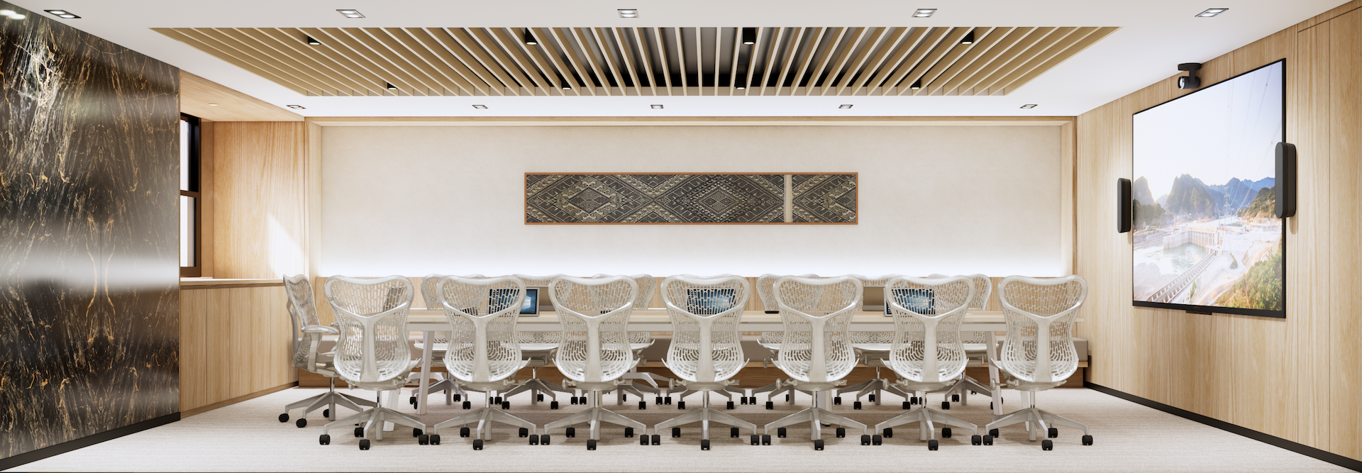 This Modern Japanese office is a sanctuary of cultural dialogue, where minimalist precision meets world-class artistry. The lobby entrance serves as a breathtaking threshold, anchored by a monumental Shoji wall crafted by a Japanese national artist, redefining traditional light filtration as a modern architectural statement. This "less is more" philosophy extends through the open-plan areas, defined by blonde timber and clean geometric lines. In the Managing Director’s private quarter, the atmosphere deepens with an exquisite Awashimono piece—a masterwork of wood carving —by a Japanese national artist, symbolizing structural depth and wisdom. Contrasting this, the private consultation rooms feature Laotian fabrics meticulously rendered in the Thai-Inu style, blending intricate Indochinese weaving with Japanese aesthetic restraint. It is a workspace where high-level diplomacy and design intersect, celebrating the shared heritage of the Silk Road through a contemporary, luminous lens.