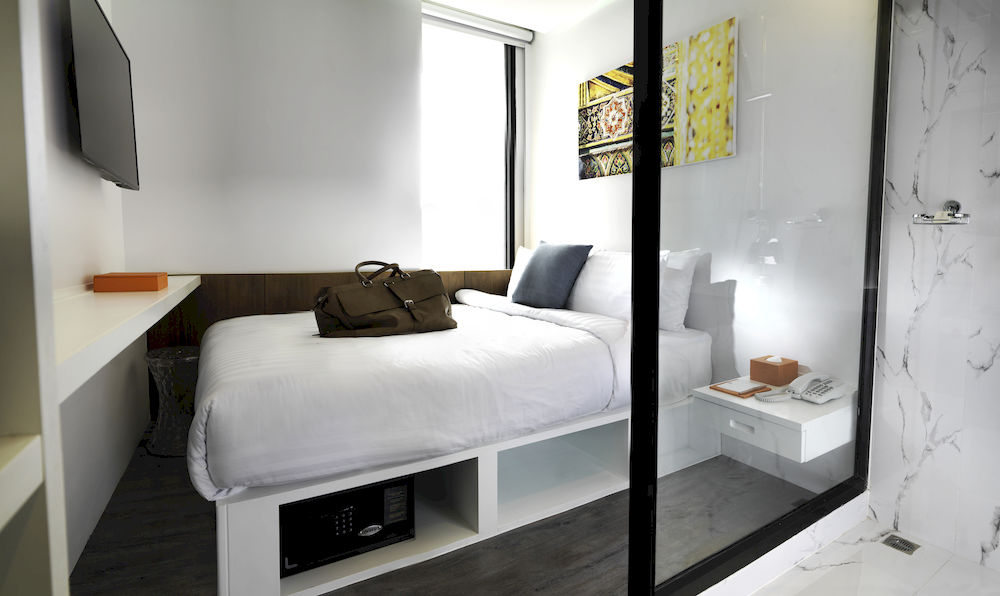 The hotel was design based on creating a playful box-sized hotel room with design wow-factor design gimmic using minimum allowed room size of 14 sq.m. (minimum allowed by building regulation) as a based modular system. Design concept is the expression through façade of an interior mood by changing interior mood color light of hotel guests. Hotel guests control the facade by light colors of lighting color control device of room interior. The design direction is also an integration of usage of italian furniture brand "Kartell" as it is one of the owner's business.